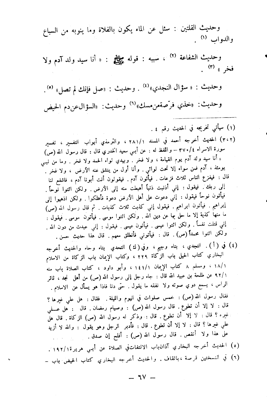 وحديث القلتين سئل عن الماء يكون بالفلاة وما ينوبه من السباع والدواب ( 1 ) وحديث الشفاعة ( 2 ) سببه قوله صلى الله عليه وسلم أنا سيد ولد آدم ولا فخر ( 3 ) وحديث سؤال النجدي ( 4 ) وحديث صل فإنك لم تصل ( 5 ) وحديث خذي فرصة من مسك ( 6 ) وحديث السؤال عن دم الحيض