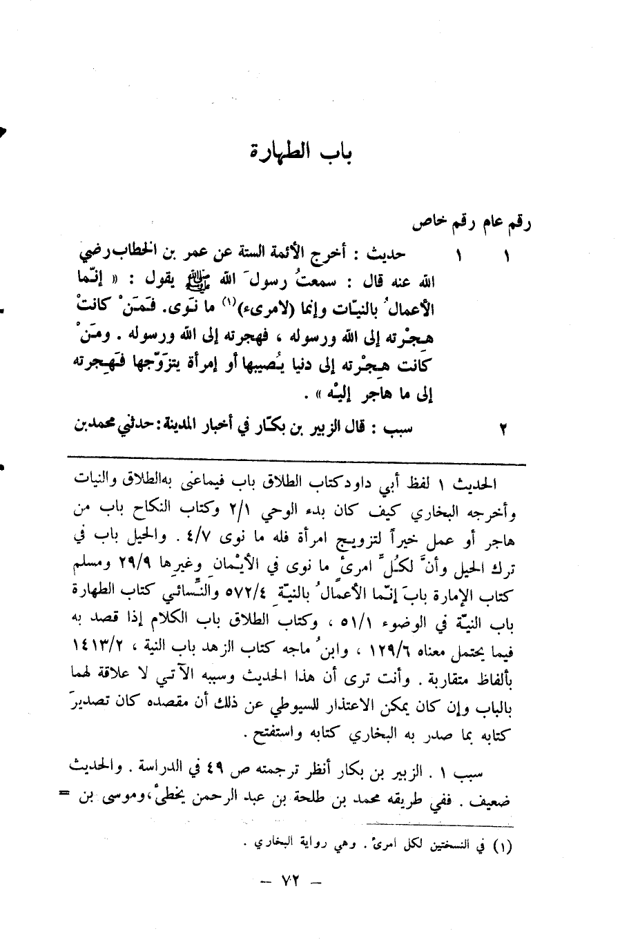 1 حديث أخرج الأئمة الستة عن عمر بن الخطاب رضي الله عنه قال سمعت رسول الله صلى الله عليه وسلم يقول إنما العمال بالنيات وإنما ( لإمرئ ) ( 1 ) ما نوى فمن كانت هجرته إلى الله ورسوله فهجرته إلى الله ورسوله ومن كانت هجرته إلى دنيا يصيبها أو إمراة يتزوجها فهجرته إلى ما هاجر إليه