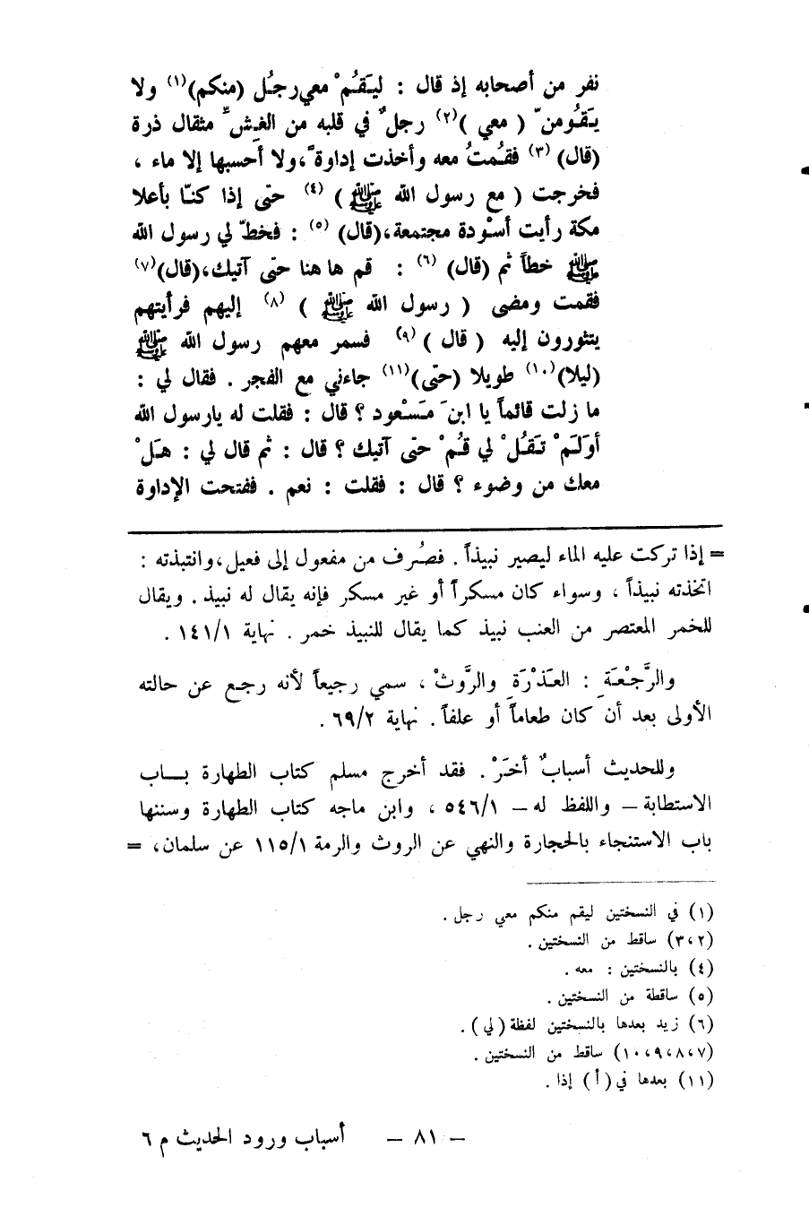 نفر من اصحابه إذ قال ليقم معي رجل ( منكم ) ( 1 ) ولا يقومن ( معي ) ( 2 ) رجل في قلبه من الغش مثقال ذرة ( قال ) ( 3 ) فقمت مع وأخذت إداوة ولا أحسبها إلا ماء فخرجت ( مع رسول الله صلى الله عليه وسلم ) ( 4 ) حتى إذا كنا بأعلا مكة رأيت أسودة مجتمعة ( قال ) ( 5 ) فخط لي رسول الله صلى الله عليه وسلم خطا ثم ( قال ) ( 6 ) قم ها هنا حتى آتيك ( قال ) ( 7 ) فقمت ومضى ( رسول الله صلى الله عليه وسلم ) ( 8 ) إليهم فرأيتهم يتثورون إليه ( قال ) ( 9 ) فسمر معهم رسول الله صلى الله عليه وسلم ( ليلا ) ( 10 ) طويلا ( حتى ) ( 11 ) جاءني مع الفجر فقال لي ما زلت قائما يا ابن مسعود قال فقلت له يا رسول الله أولم تقل لي قم حتى آتيك قال ثم قال لي هل معك من وضوء قال فقلت نعم ففتحت الاداوة