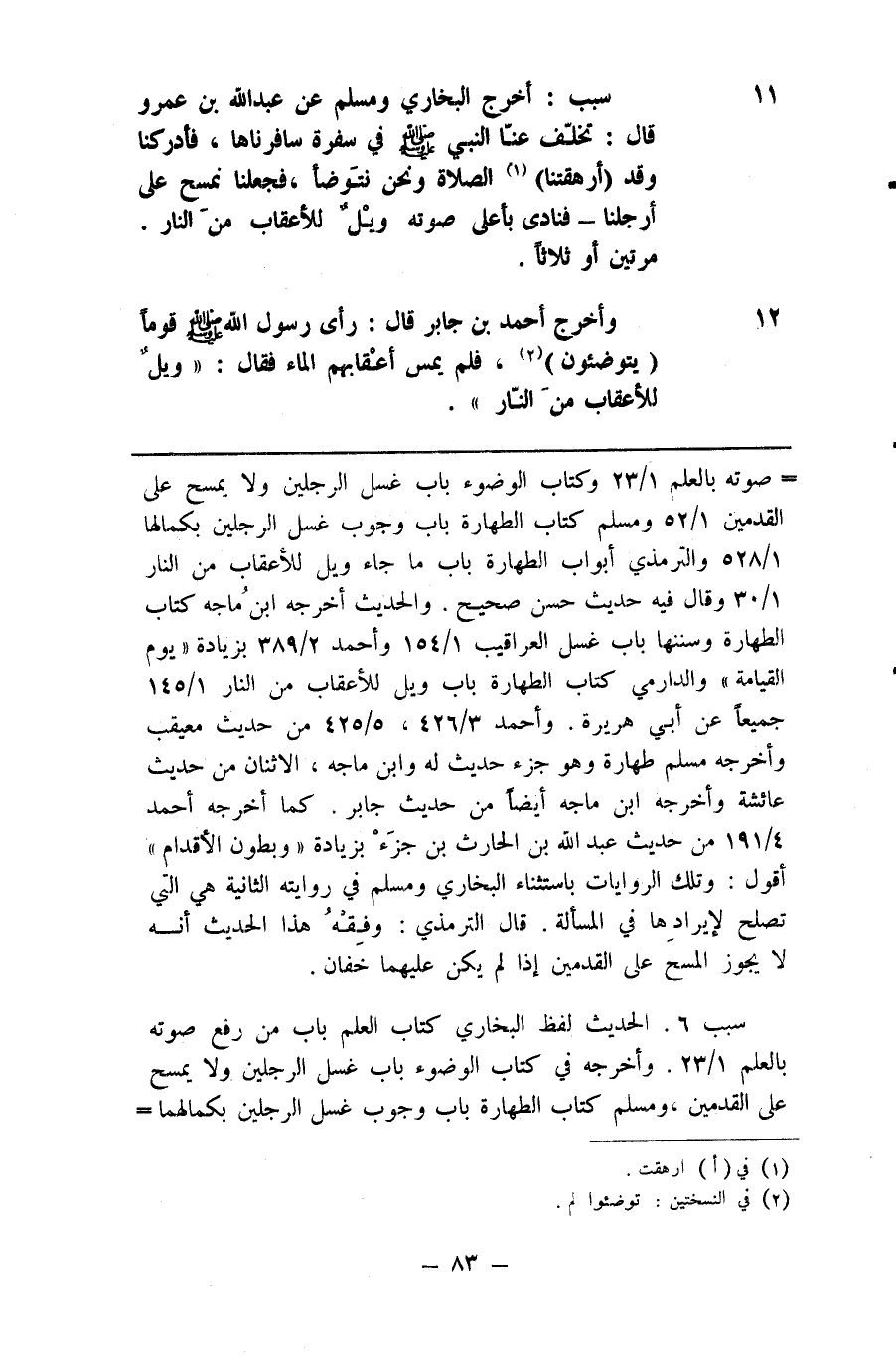 11 سبب أخرج البخاري ومسلم عن عبد الله بن عمرو قال تخلف عنا النبي صلى الله عليه وسلم في سفره سافرناها فأدركنا وقد ( أرهقتنا ) ( 1 ) الصلاة ونحن نتوضأ فجعلنا نمسح على أرجلنا فنادى بأعلى صوته ويل للأعقاب من النار مرتين أو ثلاثا