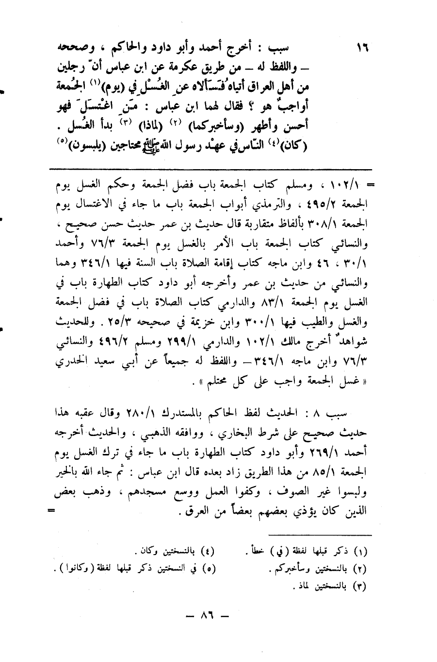 16 سبب أخرج أحمد وابو داود والحاكم وصححه واللفظ له من طريق عكرمة عن ابن عباس ان رجلين من أهل العراق أتياه فسألاه عن الغسل في ( يوم ) ( 1 ) الجمعة أواجب هو فقال لهما ابن عباس من اغتسل فهو أحسن وأطهر ( وسأخبركما ) ( 2 ) لماذا ( 3 ) بدأ الغسل ( كان ) ( 4 ) الناس في عهد رسول الله صلى الله عليه وسلم محتاجين ( يلبسون ) ( 5 )