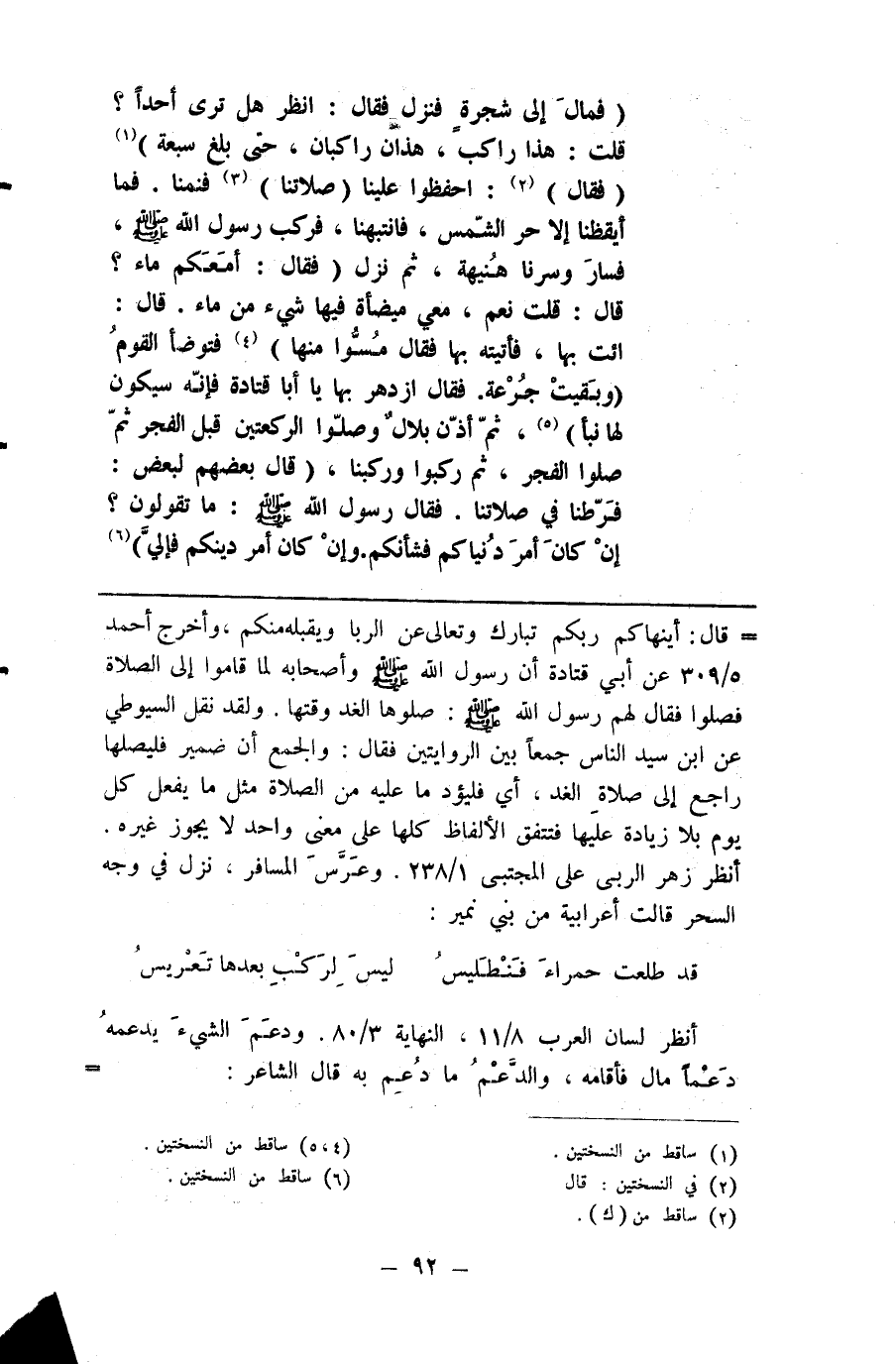 ( فمال إلى شجرة فنزل فقال انظر هل ترى أحدا قلت هذا راكب هذان راكبان حتى بلغ سبعة ) ( 1 ) ( فقال ) ( 2 ) احفظوا علينا ( صلاتنا ) ( 3 ) فنمنا فما ايقظنا إلا حر الشمس فانتبهنا فركب رسول الله صلى الله عليه وسلم فسار وسرنا هنيهة ثم نزل ( فقال أمعكم ماء قال قلت نعم معي ميضأة فيها شيء من ماء قال ائت بها فأتيته بها فقال مسوا منها ) ( 4 ) فتوضأ القوم ( وبقيت جرعة فقال ازدهر بها يا أبا قتادة فإنه سيكون لها نبأ ) ( 5 ) ثم أذن بلال وصلوا الركعتين قبل الفجر ثم صلوا الفجر ثم ركبوا وركبنا ( قال بعضهم لبعض فرطنا في صلاتنا فقال رسول الله صلى الله عليه وسلم ما تقولون إن كان أمر دنياكم فشأنكم وإن كان أمر دينكم فإلي ) ( 6 )