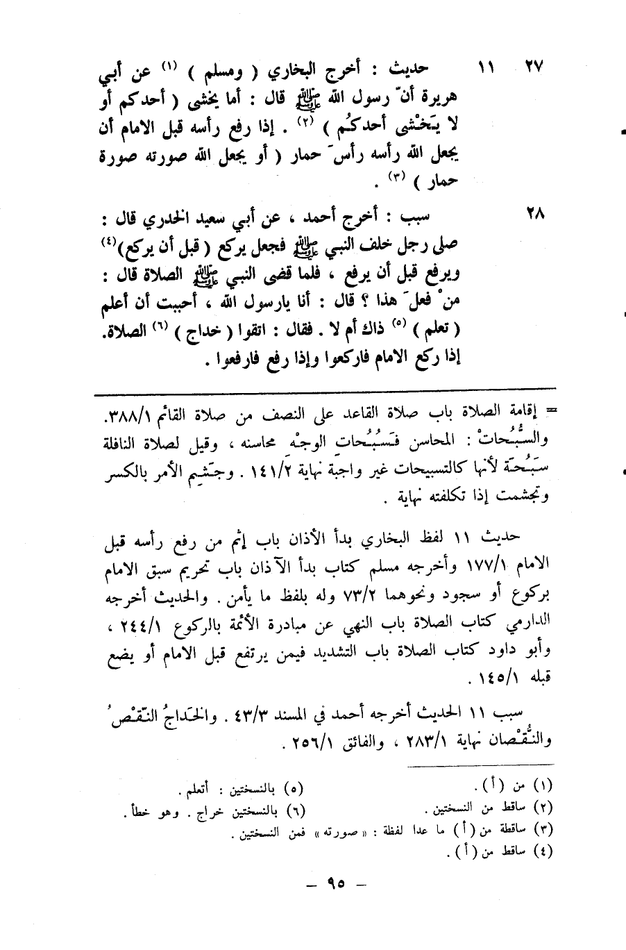 27 حديث أخرج البخاري ( ومسلم ) ( 1 ) عن أبي هريرة أن رسول الله صلى الله عليه وسلم قال أما يخشى ( أحدكم أو لا يخشى أحدكم ) ( 2 ) إذا رفع رأسه قبل الامام أن يجعل الله رأسه رأس حمار ( أو يجعل الله صورته صورة حمار ) ( 3 )