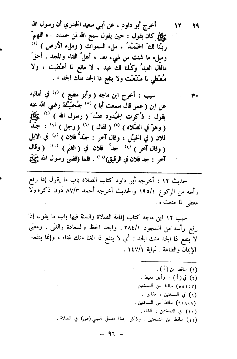 29 أخرج أبو داود عن أبي سعيد الخدري أن رسول الله صلى الله عليه وسلم كان يقول حين يقول سمع الله لمن حمده اللهم ربنا لك الحمد ملء السموات ( وملء الأرض ( 1 ) وملء ما شئت من شيء بعد أهل الثناء والمجد أحق ما قال العبد وكلنا لك عبد لا مانع لما أعطيت ولا معطي لما منعت ولا ينفع ذا الجد منك الجد
