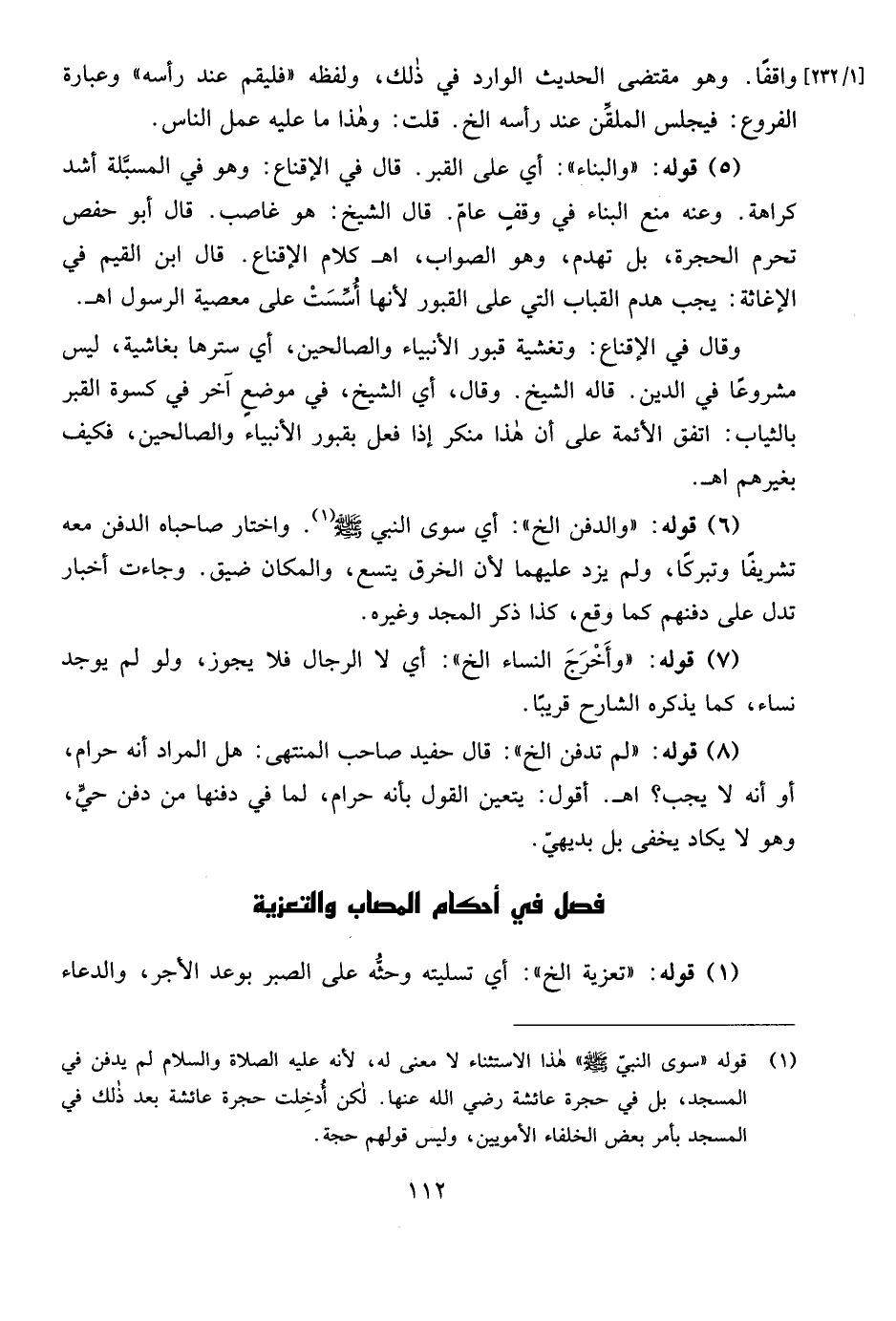 (¬1) قوله "سوى النبيّ - صلى الله عليه وسلم - " هذا الاستثناء لا معنى له، لأنه عليه الصلاة والسلام لم يدفن في المسجد، بل في حجرة عائشة رضي الله عنها. لكن أدخِلت حجرة عائشة بعد ذلك في المسجد بأمر بعض الخلفاء الأمويين، وليس قولهم حجة.