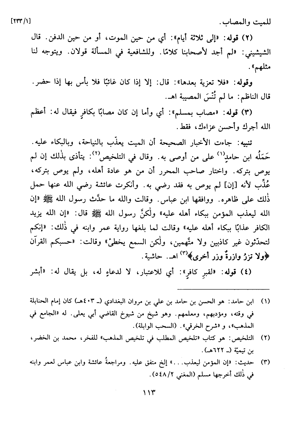(¬3) حديث: "إن المؤمن ليعذب ... " إلخ متفق عليه. ومراجعةُ عائشة وابن عباس لعمر وابنه في ذلك أخرجها مسلم (المغني 2/ 548).