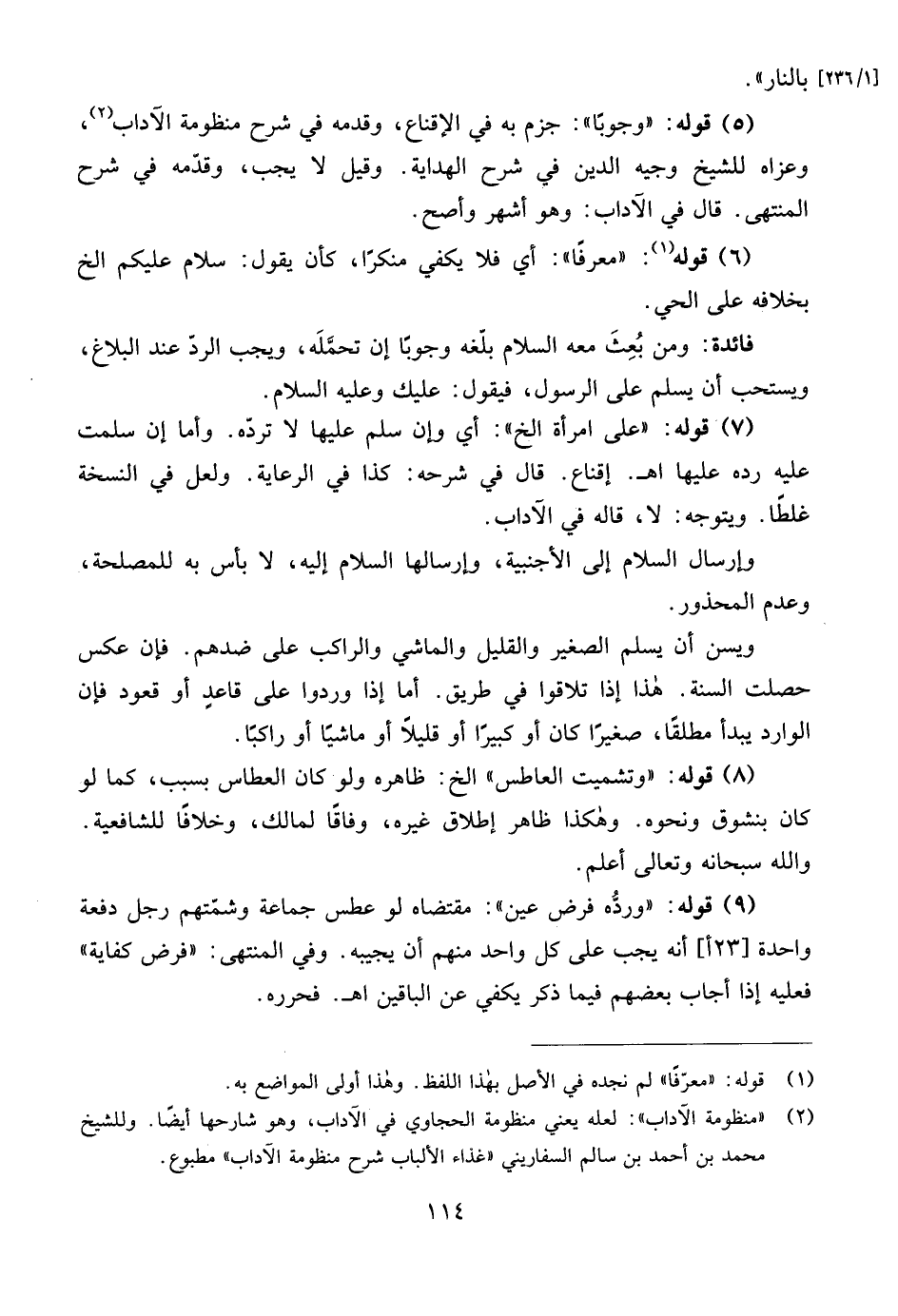 (¬2) "منظومة الآداب": لعله يعني منظومة الحجاوي في الآداب، وهو شارحها أيضًا. وللشيخ محمد بن أحمد بن سالم السفاريني "غذاء الألباب شرح منظومة الآداب" مطبوع.
