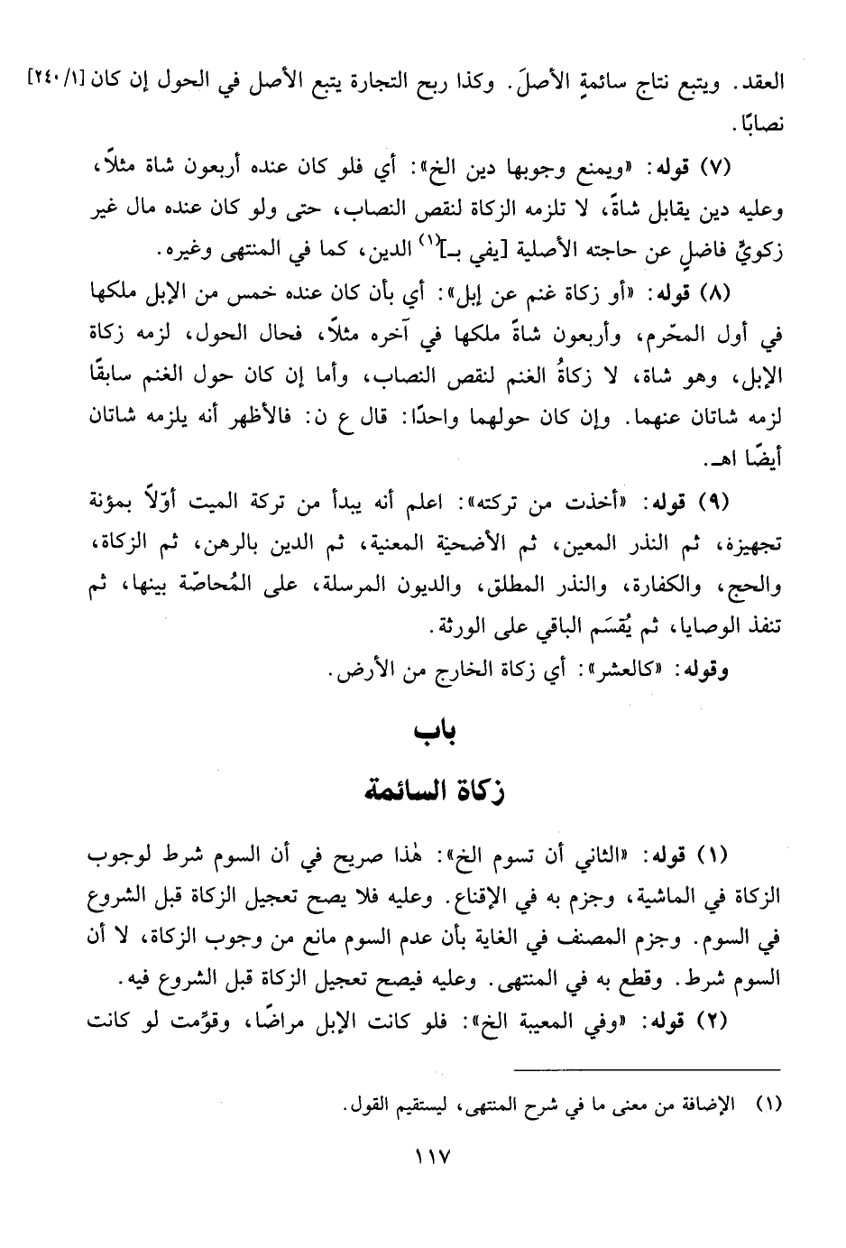(1) قوله: "الثاني أن تسوم الخ": هذا صريح في أن السوم شرط لوجوب الزكاة في الماشية، وجزم به في الإقناع. وعليه فلا يصح تعجيل الزكاة قبل الشروع في السوم. وجزم المصنف في الغاية بأن عدم السوم مانع من وجوب الزكاة، لا أن السوم شرط. وقطع به في المنتهى. وعليه فيصح تعجيل الزكاة قبل الشروع فيه.