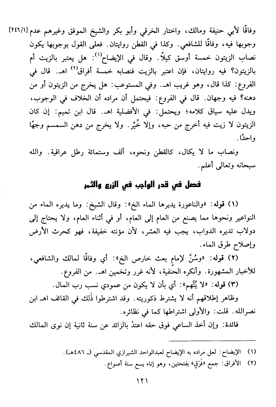 وفاقًا لأبي حنيفة ومالك، واختار الخرقي وأبو بكر والشيخ الموفق وغيرهم عدم [1/ 246] وجوبها فيه، وفاقًا للشافعي. وكذا في القطن روايتان. فعلى القول بوجوبها يكون نصاب الزيتون خمسة أوسق كيلًا. وقال في الإيضاح (¬1): هل يعتبر بالزيت أم بالزيتون؟ فيه روايتان، فإن اعتبر بالزيت فنصابه خمسة أفراق (¬2) اهـ. قال في الفروع: كذا قال، وهو غريب اهـ. وفي المستوعب: هل يخرج من الزيتون أو من دهنه؟ فيه وجهان. قال في الفروع: فيحتمل أن مراده أن الخلاف في الوجوب، ويدل عليه سياق كلامه؛ ويحتمل: في الأفضلية اهـ. قال ابن تميم: إن كان الزيتون لا زيت فيه أخرج من حبه، وإلا خُيِّر. ولا يخرج من دهن السمسم وجهًا واحدًا.
