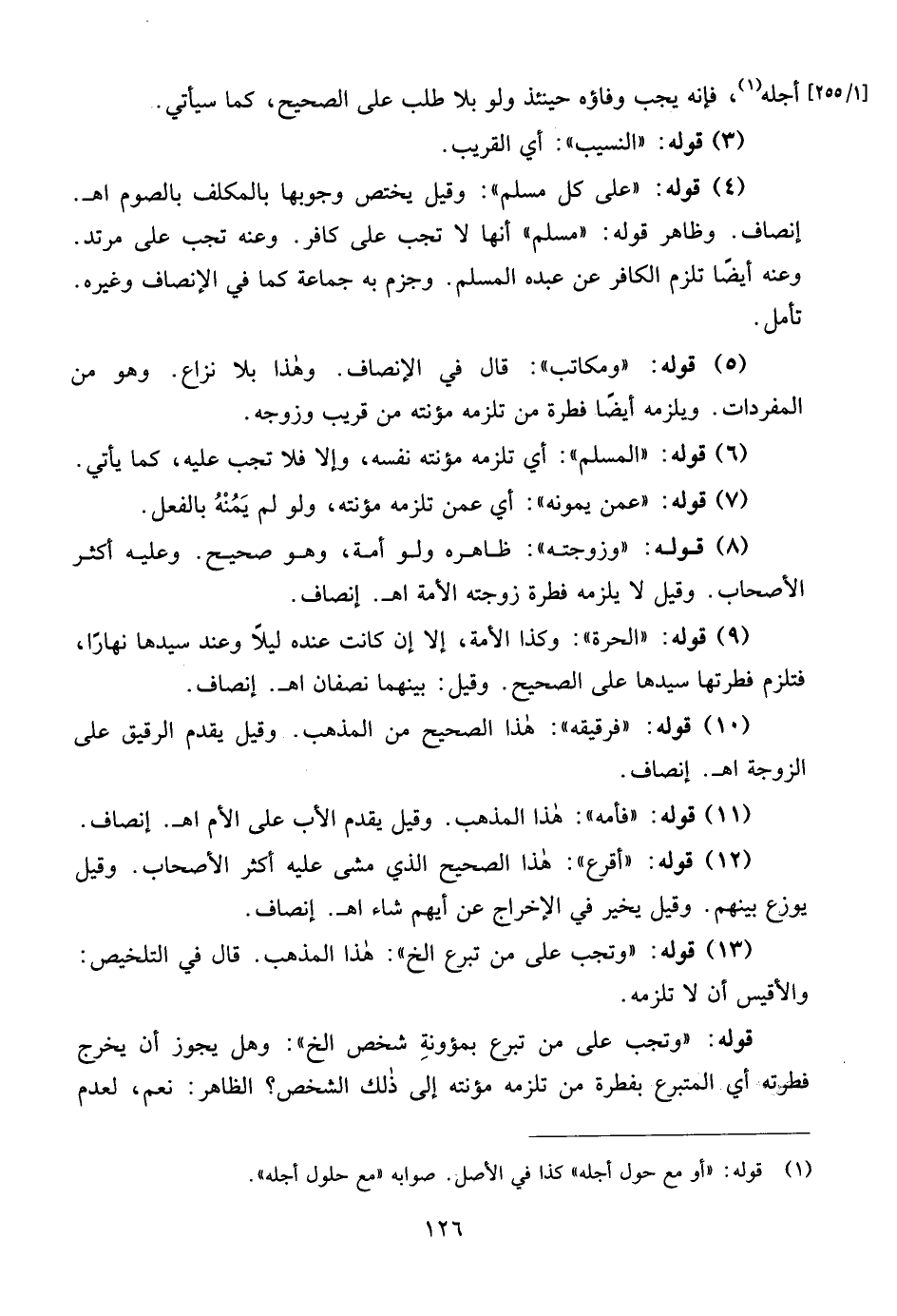 (8) قوله: "وزوجته": ظاهره ولو أمة، وهو صحيح. وعليه أكثر الأصحاب. وقيل لا يلزمه فطرة زوجته الأمة اهـ. إنصاف.