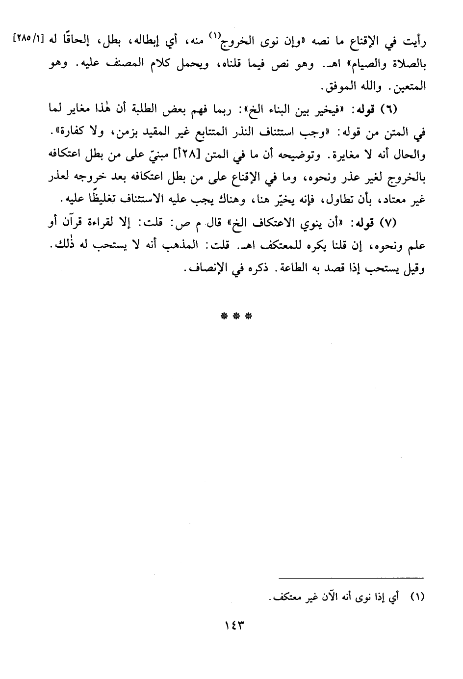 رأيت في الإقناع ما نصه "وإن نوي الخروج (¬1) منه، أي إبطاله، بطل، إلحاقًا له [1/ 285] بالصلاة والصيام" اهـ. وهو نص فيما قلناه، ويحمل كلام المصنف عليه. وهو المتعين. والله الموفق.