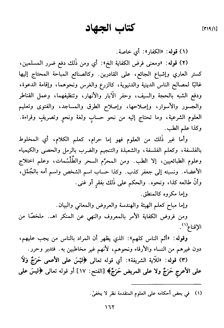 (2) قوله: "ومعنى فرض الكفاية الخ": أي ومن ذلك دفع ضرر المسلمين، كستر العاري وإشباع الجائع، على القادرين. وكالصنائع المباحة المحتاج إليها غالبًا لمصالح الناس الدينية والدنيوية، كالزرع والغرس ونحوهما، وإقامة الدعوة، ودفع الشبه بالحجة والسيف، وحفر الآبار والأنهار، وتنظيفهما، وعمل القناطر والجسور والأسوار، وإصلاحها، وإصلاح الطرق والمساجد، والفتوى وتعليم العلوم الشرعية، وما تحتاج إليه من نحو حسابٍ ولغة ونحوٍ وتصريفٍ وقراءة.