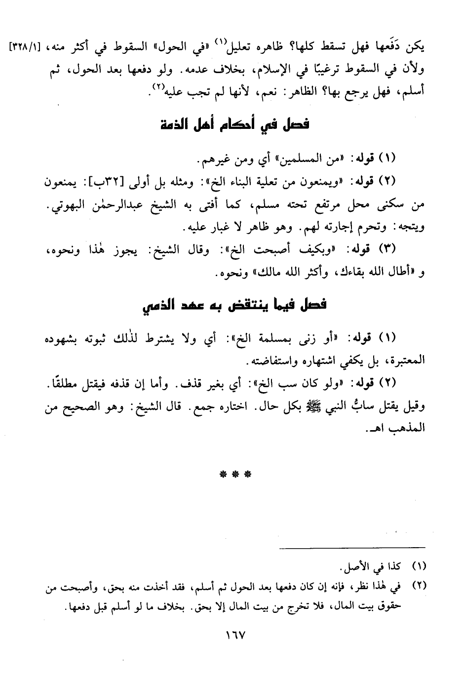 (2) قوله: "ويمنعون من تعلية البناء الخ": ومثله بل أولى [32ب]: يمنعون من سكنى محل مرتفع تحته مسلم، كما أفتى به الشيخ عبد الرحمن البهوتي. ويتجه: وتحرم إجارته لهم. وهو ظاهر لا غبار عليه.
