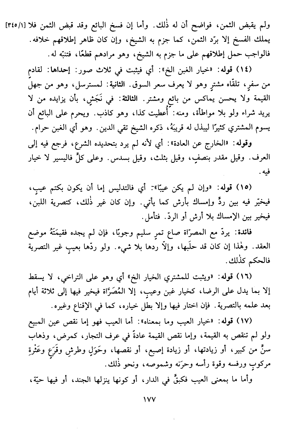 (14) قوله: "خيار الغبن الخ": أي فيثبت في ثلاث صور: إحداها: لقادمٍ من سفرٍ، تلقّاه مشترٍ وهو لا يعرف سعر السوق. الثانية: لمسترسل، وهو من جهل القيمة ولا يحسن يماكس من بائعٍ ومشتر. الثالثة: في نَجَشٍ، بأن يزايده من لا يريد شراء ولو بلا مواطأة، ومنه: أُعطيت كذا، وهو كاذب. ويحرم على البائع أن يسوم المشتري كثيرًا ليبذل له قريبَهُ، ذكره الشيخ تقي الدين. وهو أي الغبن حرام.