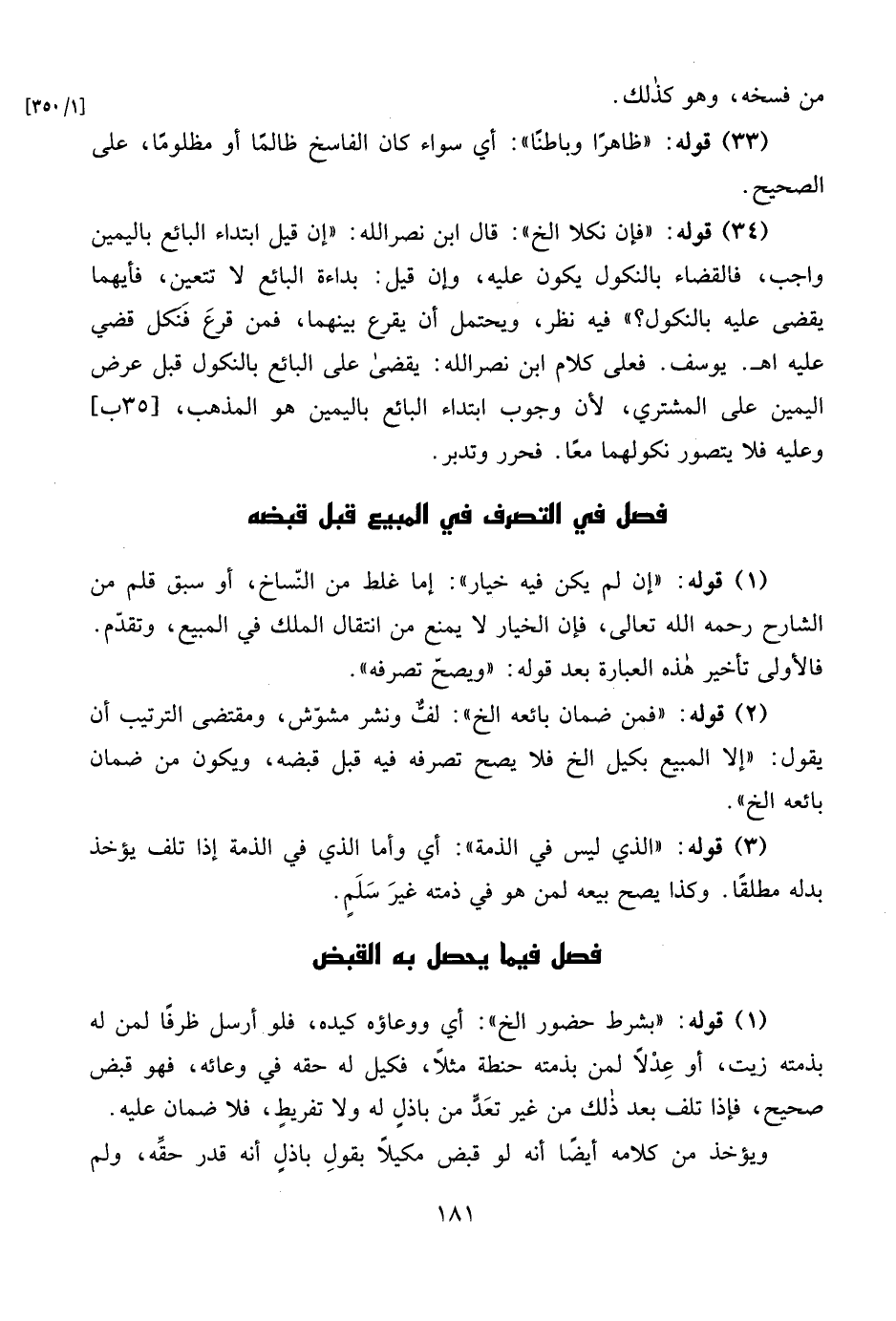 (34) قوله: "فإن نكلا الخ": قال ابن نصرالله: "إن قيل ابتداء البائع باليمين واجب، فالقضاء بالنكول يكون عليه، وإن قيل: بداءة البائع لا تتعين، فأيهما يقضى عليه بالنكول؟ " فيه نظر، ويحتمل أن يقرع بينهما، فمن قرعَ فَنكل قضي عليه اهـ. يوسف. فعلى كلام ابن نصرالله: يقضى على البائع بالنكول قبل عرض اليمين على المشتري، لأن وجوب ابتداء البائع باليمين هو المذهب، [35ب] وعليه فلا يتصور نكولهما معًا. فحرر وتدبر.