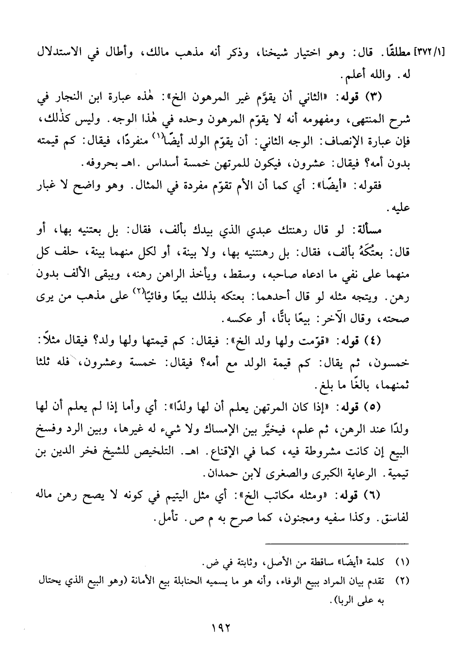 (3) قوله: "الثاني أن يقوَّم غير المرهون الخ": هذه عبارة ابن النجار في شرح المنتهى، ومفهومه أنه لا يقوّم المرهون وحده في هذا الوجه. وليس كذلك، فإن عبارة الإنصاف: الوجه الثاني: أن يقوّم الولد أيضًا (¬1) منفردًا، فيقال: كم قيمته بدون أمه؟ فيقال: عشرون، فيكون للمرتهن خمسة أسداس. اهـ بحروفه.