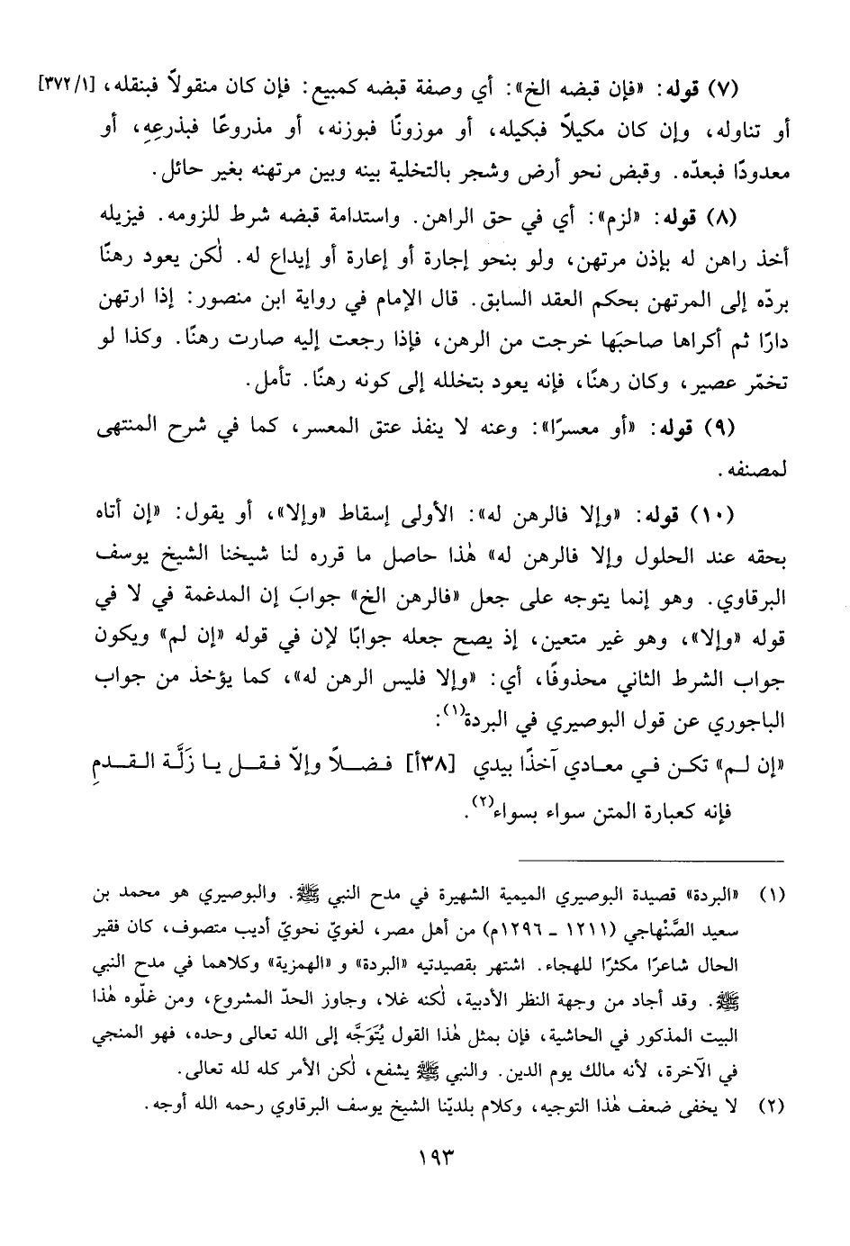 (¬1) "البردة" قصيدة البوصيري الميمية الشهيرة في مدح النبي - صلى الله عليه وسلم -. والبوصيري هو محمد بن سعيد الصَّنْهاجي (1211 - 1296م) من أهل مصر، لغويّ نحويّ أديب متصوف، كان فقير الحال شاعرًا مكثرًا للهجاء. اشتهر بقصيدتيه "البردة" و"الهمزية" وكلاهما في مدح النبي - صلى الله عليه وسلم -. وقد أجاد من وجهة النظر الأدبية، لكنه غلا، وجاوز الحدّ المشروع، ومن غلّوه هذا البيت المذكور في الحاشية، فإن بمثل هذا القول يُتَوَجه إلى الله تعالى وحده، فهو المنجي في الآخرة، لأنه مالك يوم الدين. والنبي - صلى الله عليه وسلم - يشفع، لكن الأمر كله لله تعالى.