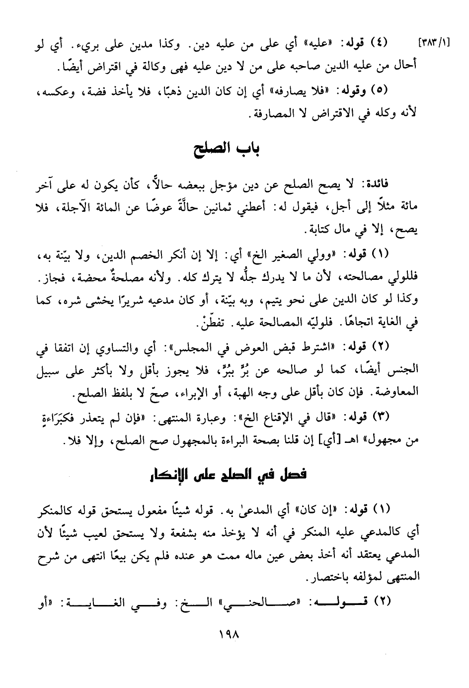 (2) قوله: "اشترط قبض العوض في المجلس": أي والتساوي إن اتفقا في الجنس أيضًا، كما لو صالحه عن برّ ببُرٍّ، فلا يجوز بأقل ولا بأكثر على سبيل المعاوضة. فإن كان بأقل على وجه الهبة، أو الإبراء، صحّ لا بلفظ الصلح.