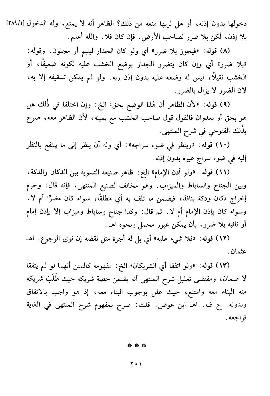(8) قوله: "فيجوز بلا ضرر" أي ولو كان الجدار ليتيم أو مجنون. وقوله: "بلا ضرر" أي وإن كان يتضرر الجدار بوضع الخشب عليه لكونه ضعيفًا، أو الخشب ثقيلاً، ليس له وضعه عليه بدون إذن ربه. ولو لم يمكن تسقيفه إلا به، لأن الضرر لا يزال بالضرر.