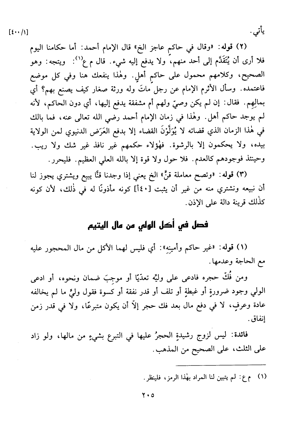 (2) قوله: "وقال في حاكمٍ عاجز الخ" قال الإمام أحمد: أما حكامنا اليوم فلا أرى أن يُتَقَدَّم إلى أحد منهم، ولا يدفع إليه شيء. قال م ع (¬1): ويتجه: وهو الصحيح، وكلامهم محمول على حاكمٍ أهلٍ. وهذا ينفعك هنا وفي كل موضع فاعتمده. وسأل الأثرم الإمام عن رجل ماتَ وله ورثة صغار كيف يصنع بهم؟ أي بمالِهِم. فقال: إن لم يكن وصيّ ولهم أم مشفقة يدفع إليها، أي دون الحاكم، لأنه لم يوجد حاكم أهل. وهذا في زمان الإمام أحمد رضي الله تعالى عنه، فما بالك في هذا الزمان الذي قضاته لا يُوَلَّوْنَ القضاء إلا بدفع العَرَض الدنيوي لمن الولاية بيده، ولا يحكمون إلا بالرشوة. فهؤلاء حكمهم غير نافذ غير شك ولا ريب.