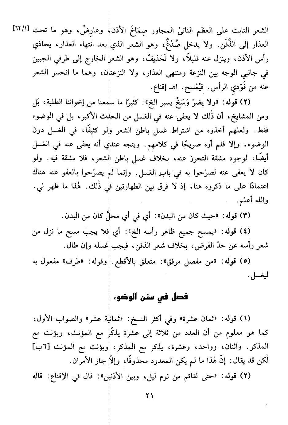 الشعر النابت على العظم الناتى المجاور صِمَاخَ الأذن، وعارِض، وهو ما تحت [1/ 62] العذار إلى الذقَن. ولا يدخل صُدعٌ، وهو الشعر الذي بعد إنتهاء العذار، يحاذي رأس الأذن، وينزل عنه قليلاً، ولا تَحْذيفٌ، وهو الشعر الخارج إلى طرفي الجبين في جانبي الوجه بين النزعة ومنتهى العذار، ولا النزعتان، وهما ما انحسر الشعر عنه من فَوْديِ الرأس. فيُمْسح. اهـ إقناع.