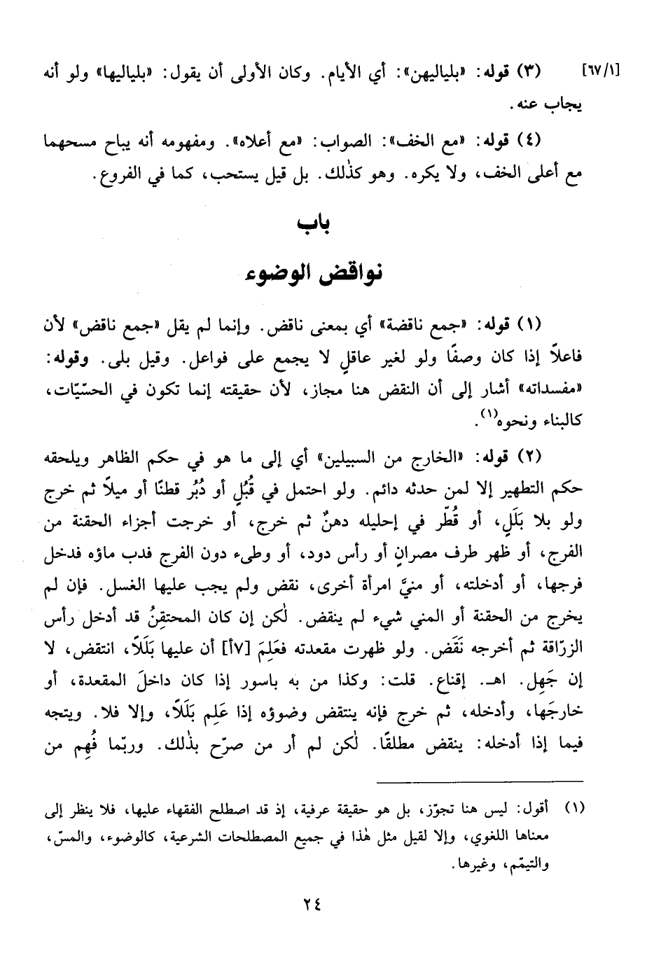 (1) قوله: "جمع ناقضة" أي بمعنى ناقض. وإنما لم يقل "جمع ناقض" لأن فاعلًا إذا كان وصفًا ولو لغير عاقلٍ لا يجمع على فواعل. وقيل بلى. وقوله: "مفسداته" أشار إلى أن النقض هنا مجاز، لأن حقيقته إنما تكون في الحسّيات، كالبناء ونحوه (¬1).