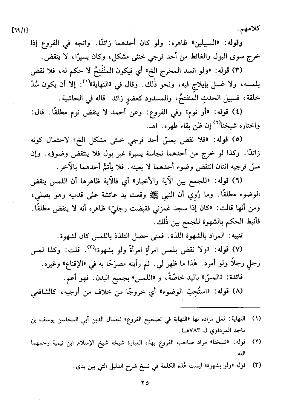 (7) قوله: "ولا نقض بلمس امرأةٍ امرأةً ولو بشهوة" (¬3). قلت: وكذا لمس رجلٍ رجلاً ولو أمرد. هذا مما ظهر لي. ثم رأيته مصرّحًا به في "الإقناع" وغيره.