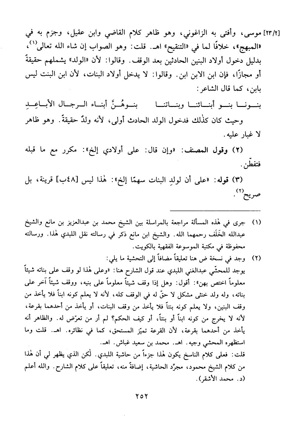 [2/ 23] موسى، وأفتى به الزاغوني، وهو ظاهر كلام القاضي وابن عقيل، وجزم به في "المبهج"، خلافاً لما في "التنقيح" اهـ. قلت: وهو الصواب إن شاء الله تعالى (¬1)، بدليل دخول أولاد البنين الحادثين بعد الوقف. وقالوا: لأن "الولد" يشملهم حقيقةً أو مجازًا، فإن ابن الابن ابن. وقالوا: لا يدخل أولاد البنات، لأن ابن البنت ليس بابن، كما قال الشاعر: