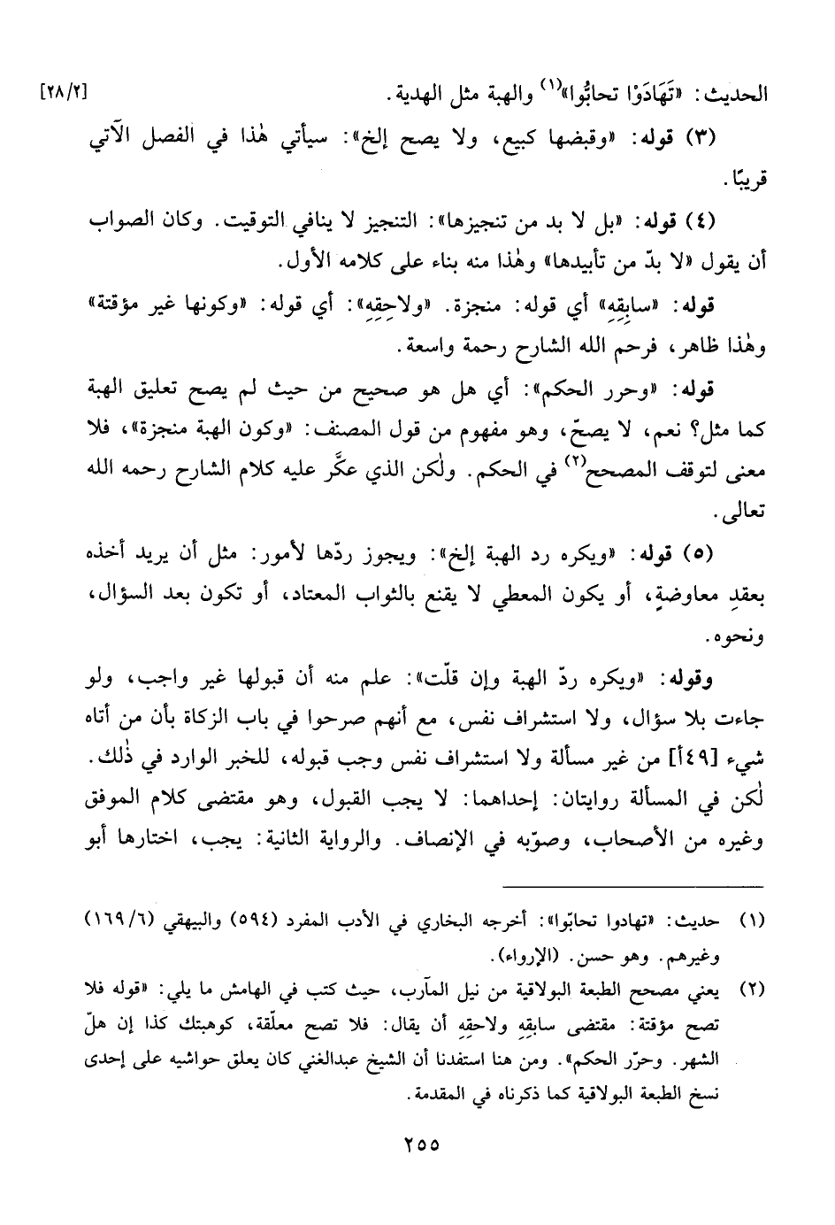 (¬2) يعني مصحح الطبعة البولاقية من نيل المآرب، حيث كتب في الهامش ما يلي: "قوله فلا تصح مؤقتة: مقتضى سابقِهِ ولاحقِهِ أن يقال: فلا تصح معلّقة، كوهبتك كذا إن هلّ الشهر. وحرّر الحكم". ومن هنا استفدنا أن الشيخ عبد الغني كان يعلق حواشيه على إحدى نسخ الطبعة البولاقية كما ذكرناه في المقدمة.