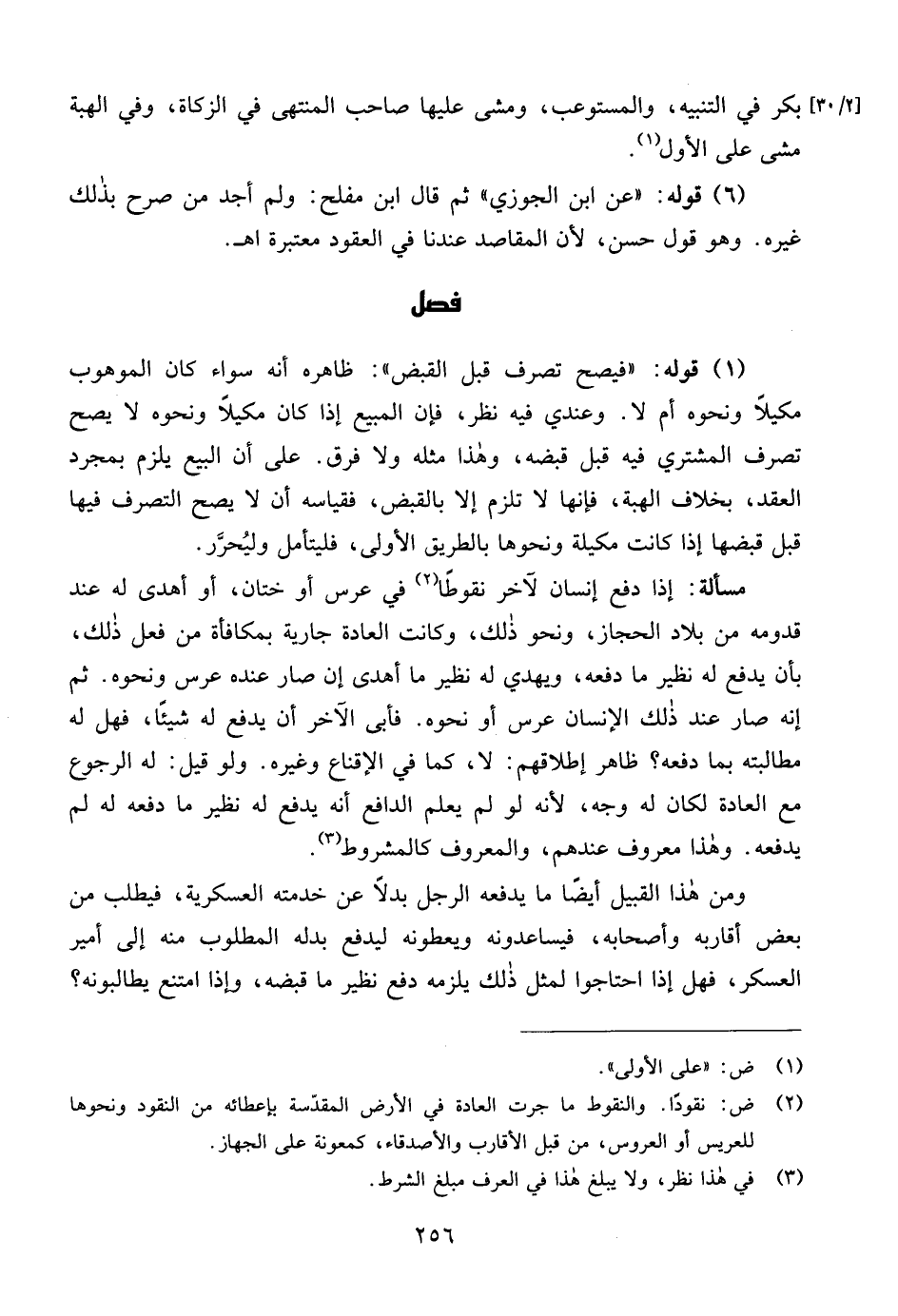 (6) قوله: "عن ابن الجوزي" ثم قال ابن مفلح: ولم أجد من صرح بذلك غيره. وهو قول حسن، لأن المقاصد عندنا في العقود معتبرة اهـ.