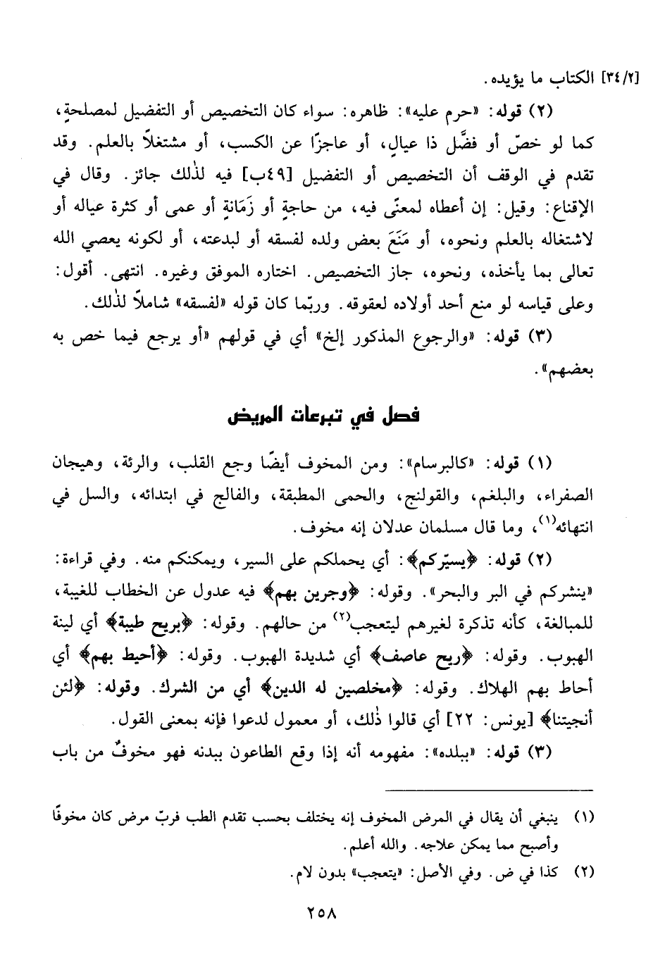 (2) قوله: "حرم عليه": ظاهره: سواء كان التخصيص أو التفضيل لمصلحةٍ، كما لو خصّ أو فضَّل ذا عيالٍ، أو عاجزًا عن الكسب، أو مشتغلاً بالعلم. وقد تقدم في الوقف أن التخصيص أو التفضيل [49ب] فيه لذلك جائز. وقال في الإقناع: وقيل: إن أعطاه لمعنًى فيه، من حاجةٍ أو زَمَانةٍ أو عمى أو كثرة عياله أو لاشتغاله بالعلم ونحوه، أو مَنَعَ بعض ولده لفسقه أو لبدعته، أو لكونه يعصي الله تعالى بما يأخذه، ونحوه، جاز التخصيص. اختاره الموفق وغيره. انتهى. أقول: وعلى قياسه لو منع أحد أولاده لعقوقه. وربّما كان قوله "لفسقه" شاملاً لذلك.