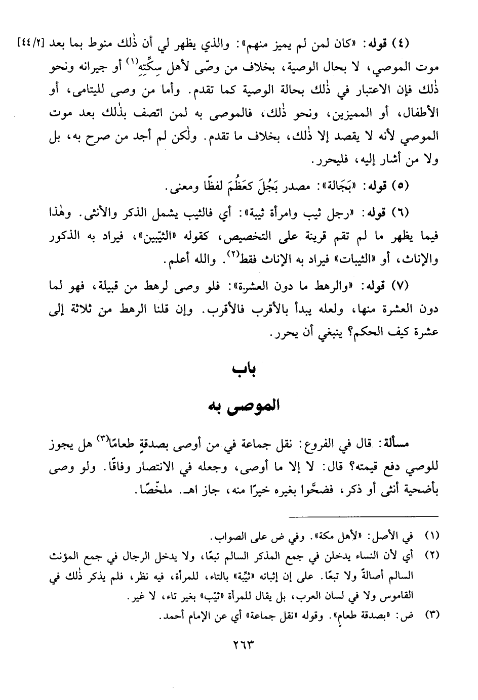 (4) قوله: "كان لمن لم يميز منهم": والذي يظهر لي أن ذلك منوط بما بعد [2/ 44] موت الموصي، لا بحال الوصية، بخلاف من وصّى لأهل سِكِّتِهِ (¬1) أو جيرانه ونحو ذلك فإن الاعتبار في ذلك بحالة الوصية كما تقدم. وأما من وصى لليتامى، أو الأطفال، أو المميزين، ونحو ذلك، فالموصى به لمن اتصف بذلك بعد موت الموصي لأنه لا يقصد إلا ذلك، بخلاف ما تقدم. ولكن لم أجد من صرح به، بل ولا من أشار إليه، فليحرر.