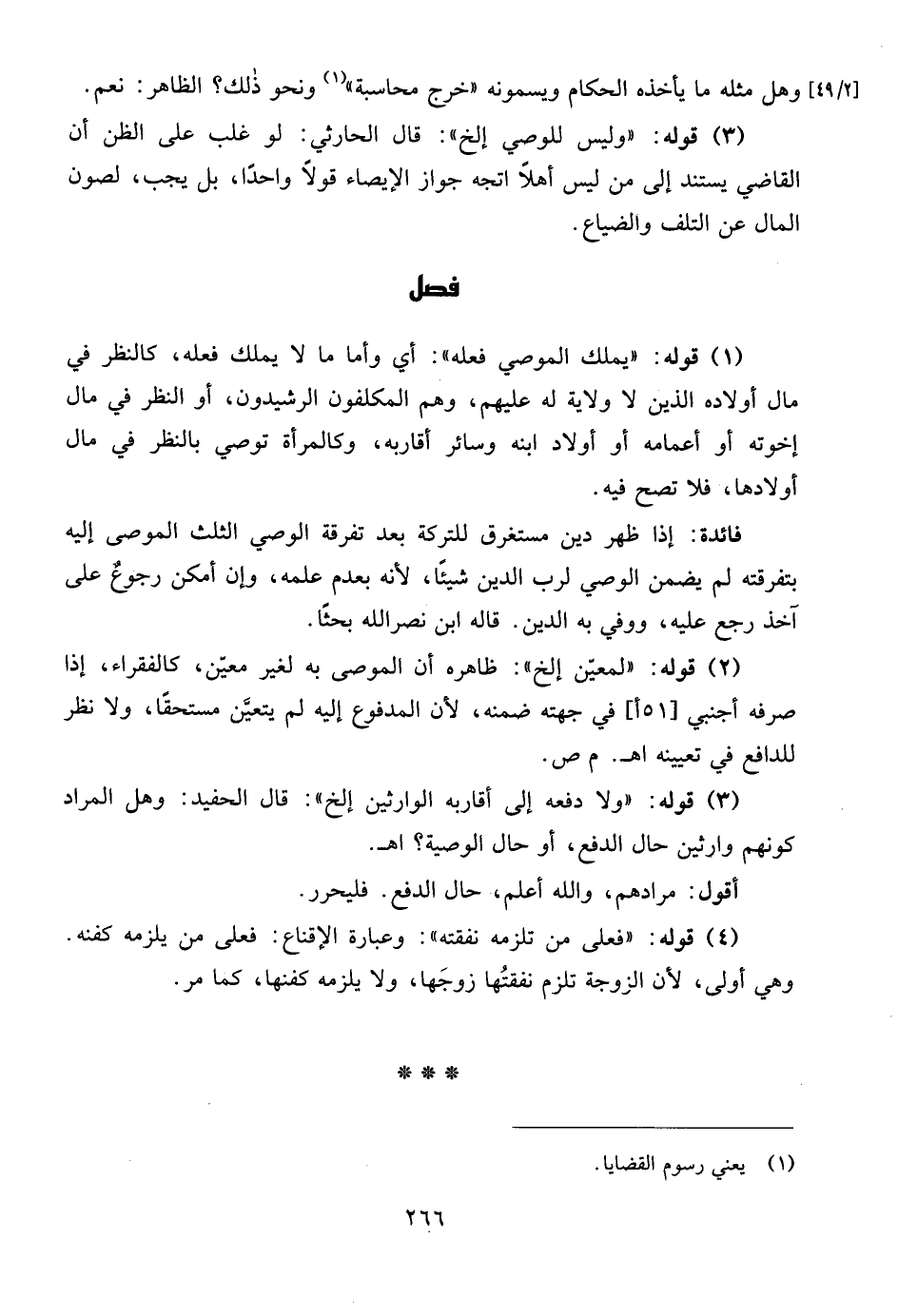 (1) قوله: "يملك الموصي فعله": أي وأما ما لا يملك فعله، كالنظر في مال أولاده الذين لا ولاية له عليهم، وهم المكلفون الرشيدون، أو النظر في مال إخوته أو أعمامه أو أولاد ابنه وسائر أقاربه، وكالمرأة توصي بالنظر في مال أولادها، فلا تصح فيه.