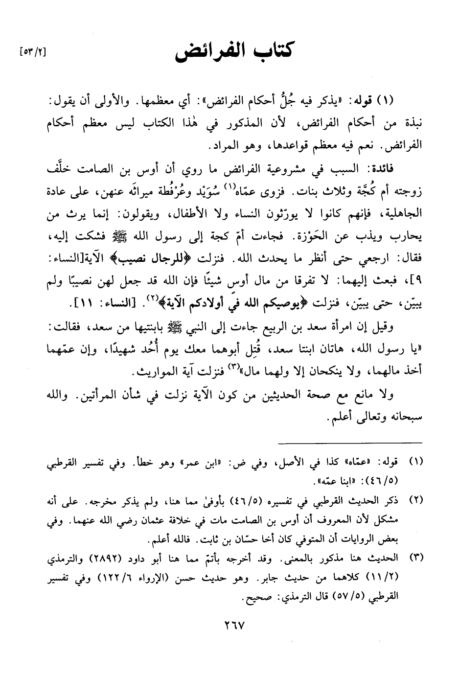فائدة: السبب في مشروعية الفرائض ما روي أن أوس بن الصامت خلَّف زوجته أم كُجَّة وثلاث بنات. فزوى عمّاه (¬1) سُوَيْد وعُرْفُطة ميراثَه عنهن، على عادة الجاهلية، فإنهم كانوا لا يورّثون النساء ولا الأطفال، ويقولون: إنما يرث من يحارب ويذب عن الحَوْزة. فجاءت أمّ كجة إلى رسول الله - صلى الله عليه وسلم - فشكت إليه، فقال: ارجعي حتى انظر ما يحدث الله. فنزلت {للرجال نصيب} الآية [النساء: 9]، فبعث إليهما: لا تفرقا من مال أوسٍ شيئاً فإن الله قد جعل لهن نصيبًا ولم يبيّن، حتى يبتن، فنزلت {يوصيكم الله في أولادكم الآية} (¬2). [النساء: 11].