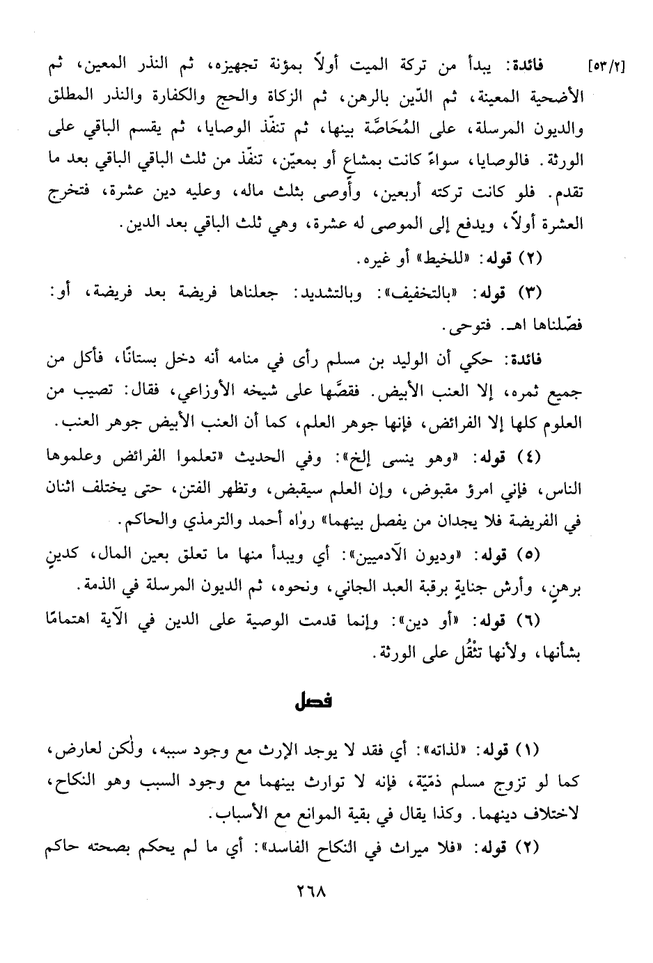 فائدة: حكي أن الوليد بن مسلم رأى في منامه أنه دخل بستانًا، فأكل من جميع ثمره، إلا العنب الأبيض. فقصَّها على شيخه الأوزاعي، فقال: تصيب من العلوم كلها إلا الفرائض، فإنها جوهر العلم، كما أن العنب الأبيض جوهر العنب.