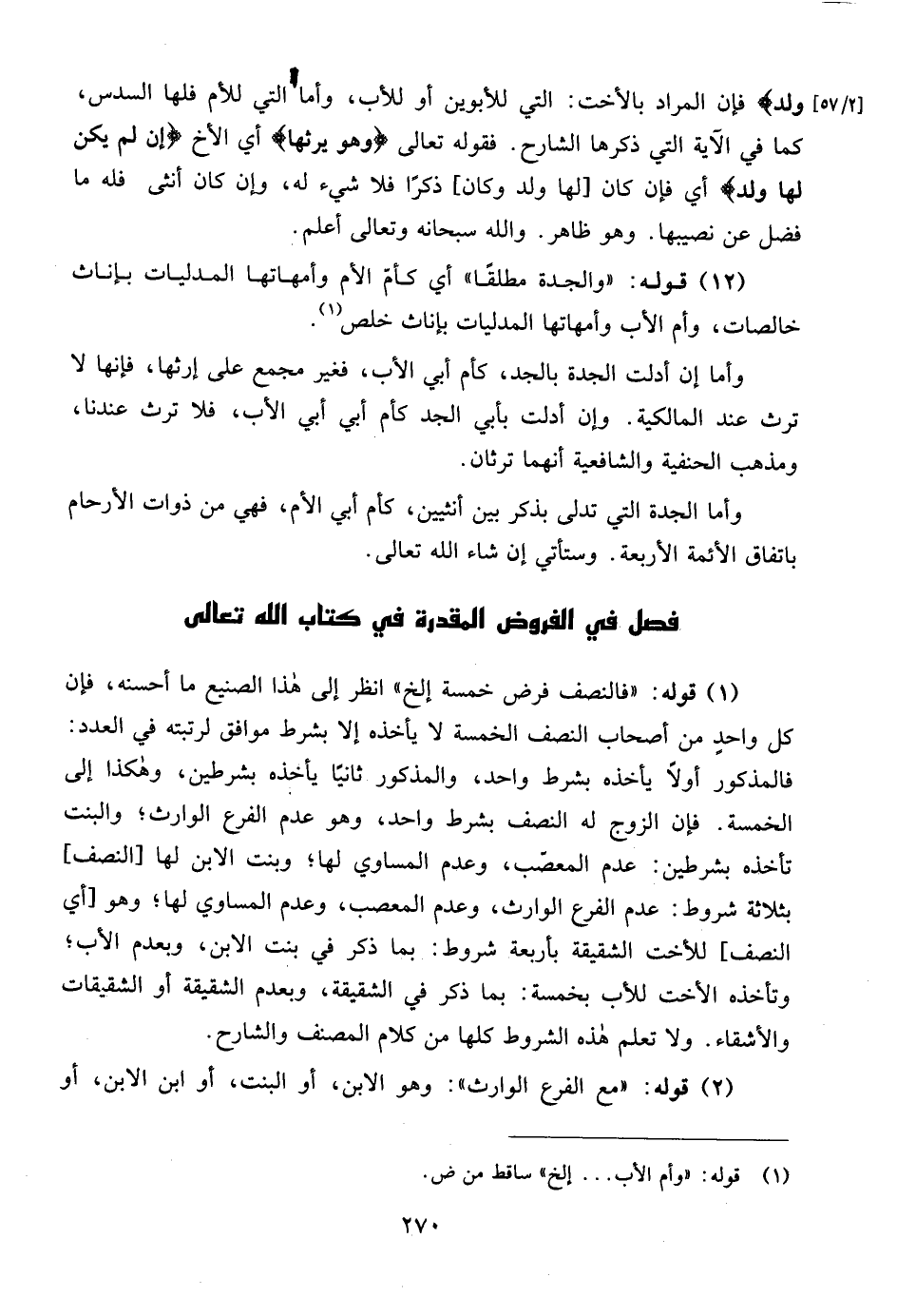 [2/ 57] ولد} فإن المراد بالأخت: التي للأبوين أو للأب، وأما التي للأم فلها السدس، كما في الآية التي ذكرها الشارح. فقوله تعالى {وهو يرثها} أي الأخ {إن لم يكن لها ولد} أي فإن كان {لها ولد وكان} ذكرًا فلا شيء له، وإن كان أنثى فله ما فضل عن نصيبها. وهو ظاهر. والله سبحانه وتعالى أعلم.