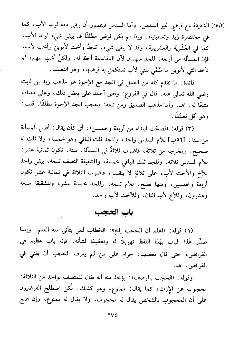 (1) قوله: "اعلم أن الحجب إلخ": الخطاب لمن يتأتى منه العلم. وإنما صدِّر هذا الباب بهذا اللفظ تهويلاً له وتعظيمًا لشأنه، فإنه باب عظيم في الفرائض، حتى قال بعضهم: حرام على من لم يعرف الحجب أن يفتي في الفرائض. اهـ.
