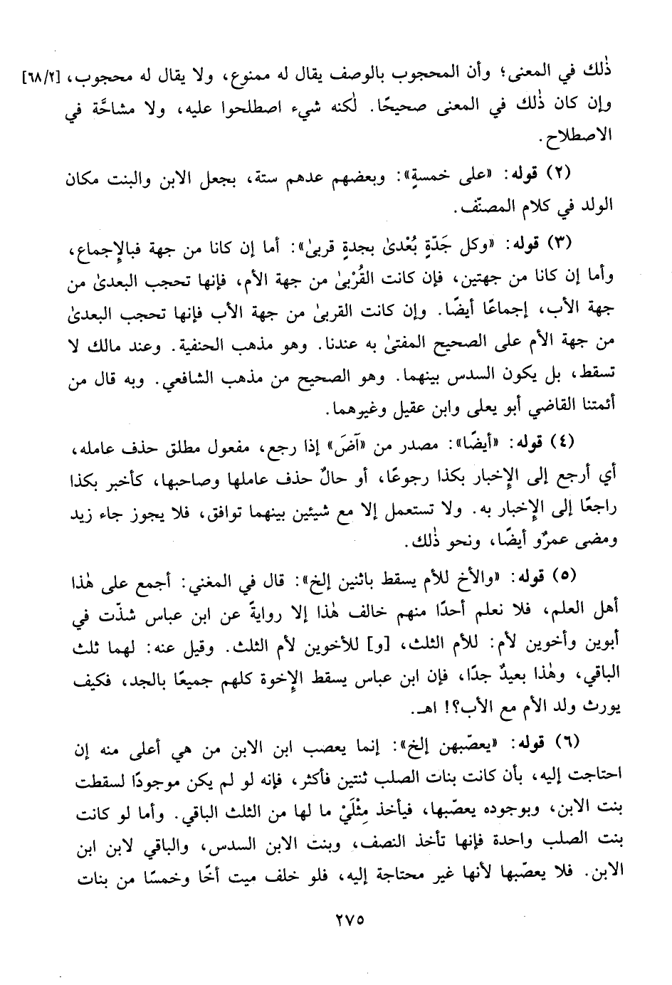 (6) قوله: "يعصّبهن إلخ": إنما يعصب ابن الابن من هي أعلى منه إن احتاجت إليه، بأن كانت بنات الصلب ثنتين فأكثر، فإنه لو لم يكن موجودًا لسقطت بنت الابن، وبوجوده يعصّبها، فيأخذ مِثْلَيْ ما لها من الثلث الباقي. وأما لو كانت بنت الصلب واحدة فإنها تأخذ النصف، وبنت الابن السدس، والباقي لابن ابن الابن. فلا يعصّبها لأنها غير محتاجة إليه، فلو خلف ميت أخًا وخمسًا من بنات