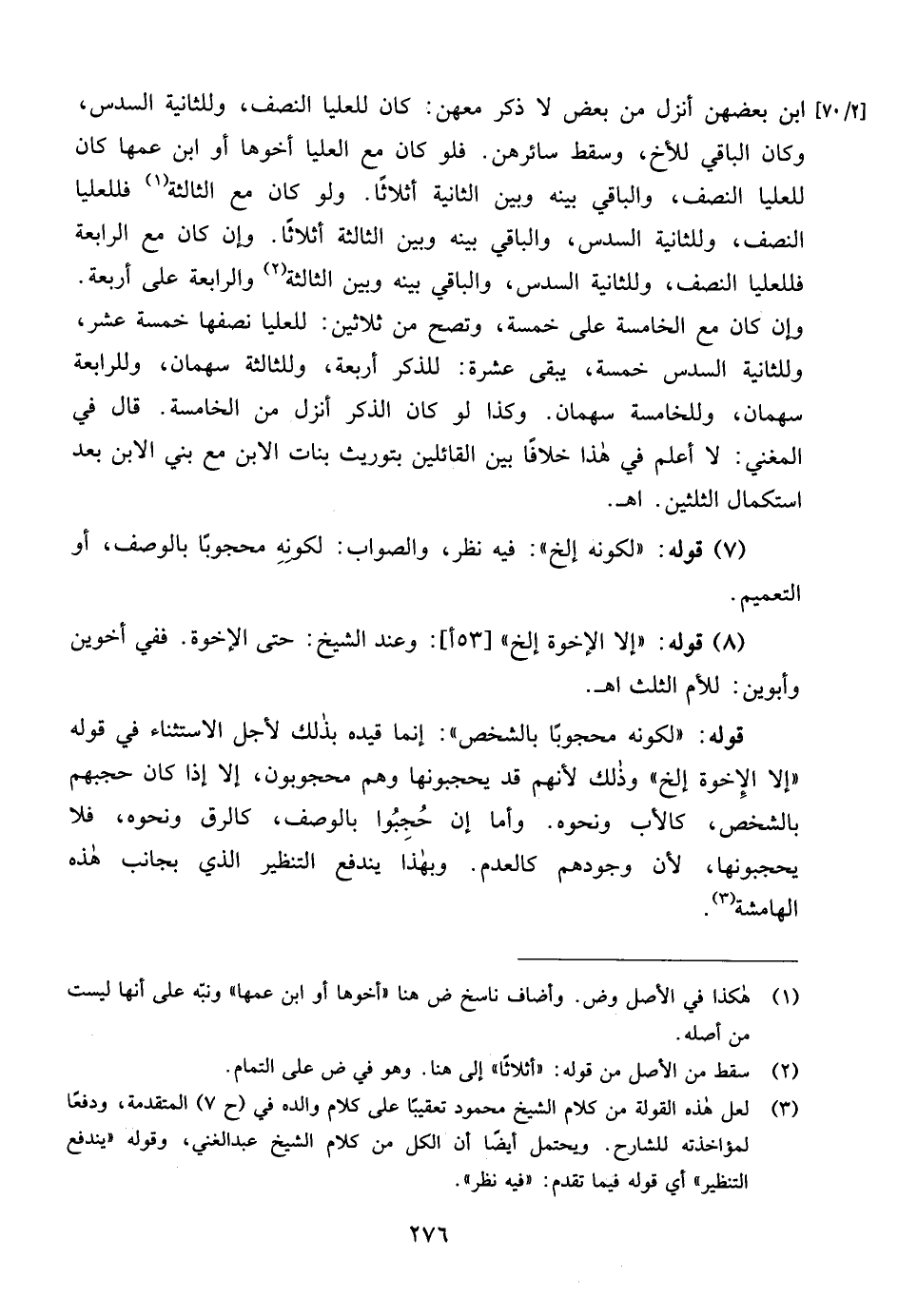 قوله: "لكونه محجوبًا بالشخص": إنما قيده بذلك لأجل الاستثناء في قوله "إلا الِإخوة إلخ" وذلك لأنهم قد يحجبونها وهم محجوبون، إلا إذا كان حجبهم بالشخص، كالأب ونحوه. وأما إن حُجبُوا بالوصف، كالرق ونحوه، فلا يحجبونها، لأن وجودهم كالعدم. وبهذَا يندفع التنظير الذي بجانب لهذه الهامشة (¬3).