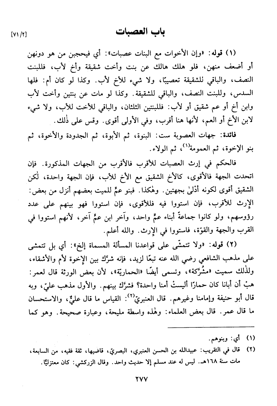(2) قوله: "ولا تتمشّى على قواعدنا المسألة المسماة إلخ": أي بل تتمشى على مذهب الشافعي رضي الله عنه تبعًا لزيد، فإنه شرَّك بين الِإخوة لأم والأشقاء، ولذلك سميت "مشُرًكة"، وتسمى أيضَا "الحماريّة"، لأن بعض الورثة قال لعمر: هبْ أن أبانا كان حمارًا أليستْ أمنا واحدة؟ فشرَّك بينهم. والأول مذهب عليّ، وبه قال أبو حنيفة وإمامنا وغيرهم. قال العنبريّ (¬2): القياس ما قال عليٌّ، والاستحسان ما قال عمر. قال بعض العلماء: وهذه واسطة مليحة، وعبارة صحيحة. وهو كما