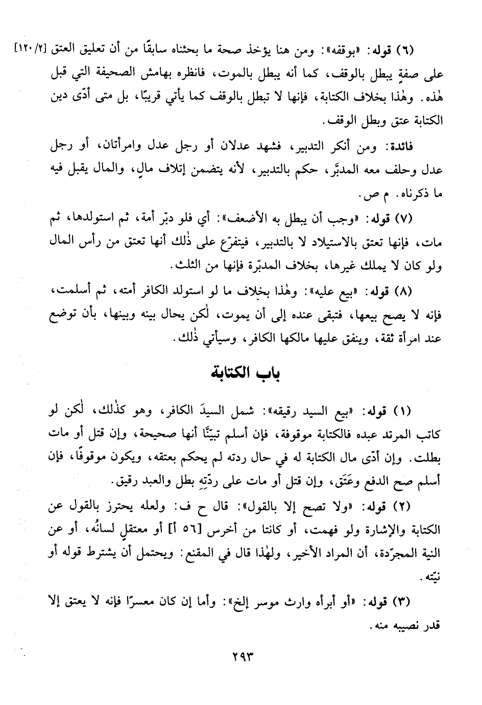 (6) قوله: "بوقفه": ومن هنا يؤخذ صحة ما بحثناه سابقًا من أن تعليق العتق [2/ 120] على صفةٍ يبطل بالوقف، كما أنه يبطل بالموت، فانظره بهامش الصحيفة التي قبل هذه. وهذا بخلاف الكتابة، فإنها لا تبطل بالوقف كما يأتي قريبًا، بل متى أدّى دين الكتابة عتق وبطل الوقف.