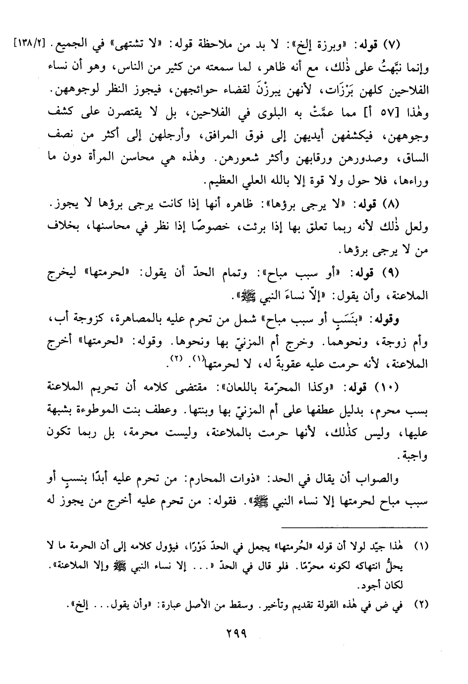 (7) قوله: "وبرزة إلخ": لا بد من ملاحظة قوله: "لا تشتهى" في الجميع. [2/ 138] وإنما نبَّهتُ على ذلك، مع أنه ظاهر، لما سمعته من كثير من الناس، وهو أن نساء الفلاحين كلهن بَرْزَات، لأنهن يبرزْنَ لقضاء حوائجهن، فيجوز النظر لوجوههن.