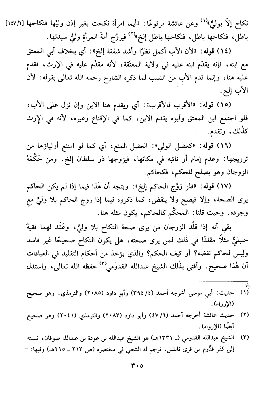 بقي أنه إذا قلَّد الزوجان من يرى صحة النكاح بلا وفي، وعَقَد لهما فقيهٌ حنبليٌّ مثلاً مقلذا في ذلك لمن يرى صحته، هل يكون النكاح صحيحًا غير فاسد وليس لحاكم نقضه؟ أو كيف الحكم؟ والذي يؤخذ من أحكام التقليد في العبادات أن هذا صحيح. وأفتى بذلك الشيخ عبد الله القدومي (¬3) حفظه الله تعالى، واستدل