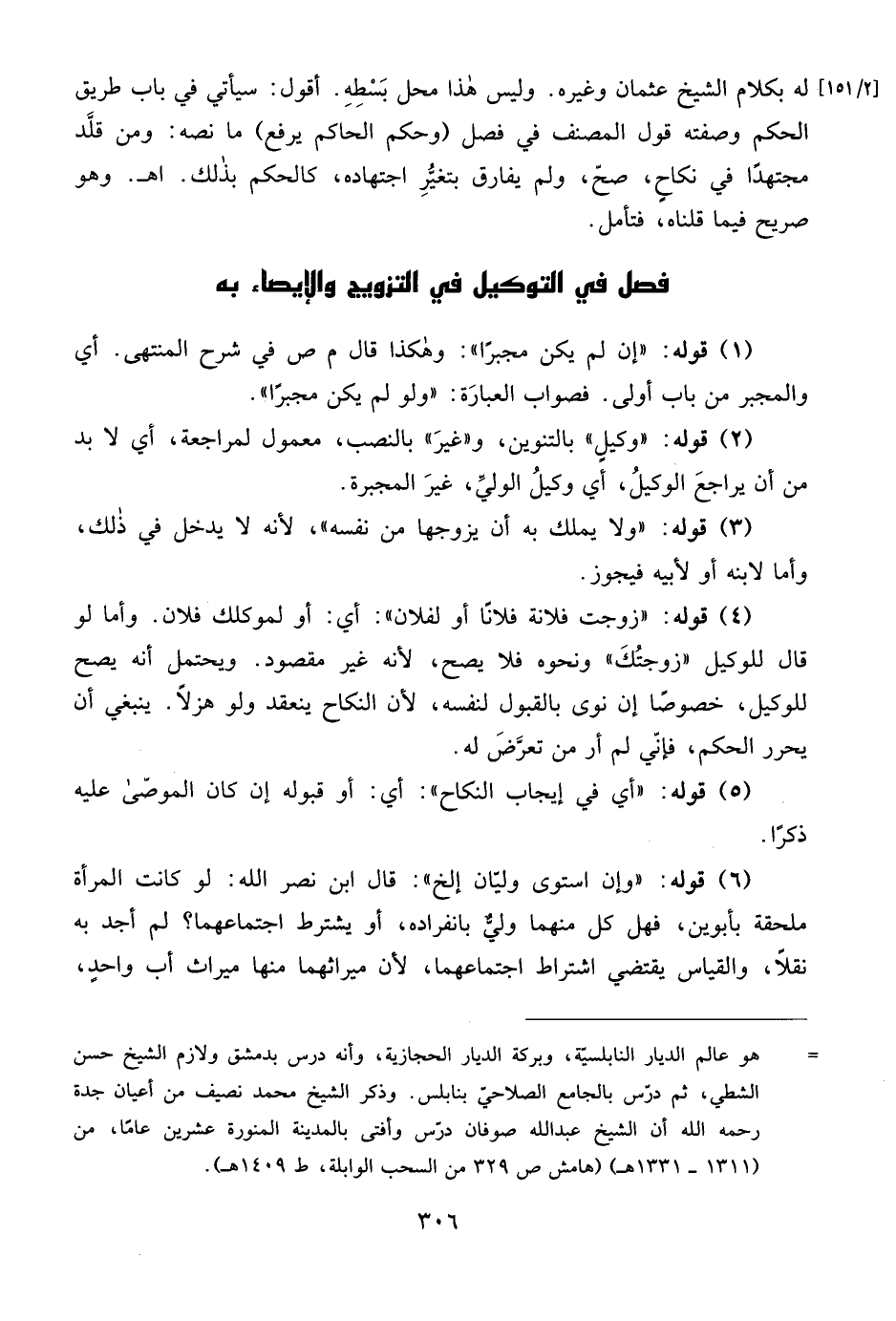 [2/ 151] له بكلام الشيخ عثمان وغيره. وليس هذا محل بَسْطِهِ. أقول: سيأتي في باب طريق الحكم وصفته قول المصنف في فصل (وحكم الحاكم يرفع) ما نصه: ومن قلّد مجتهدًا في نكاحٍ، صحّ، ولم يفارق بتغيُّرِ اجتهاده، كالحكم بذلك. اهـ. وهو صريح فيما قلناه، فتأمل.