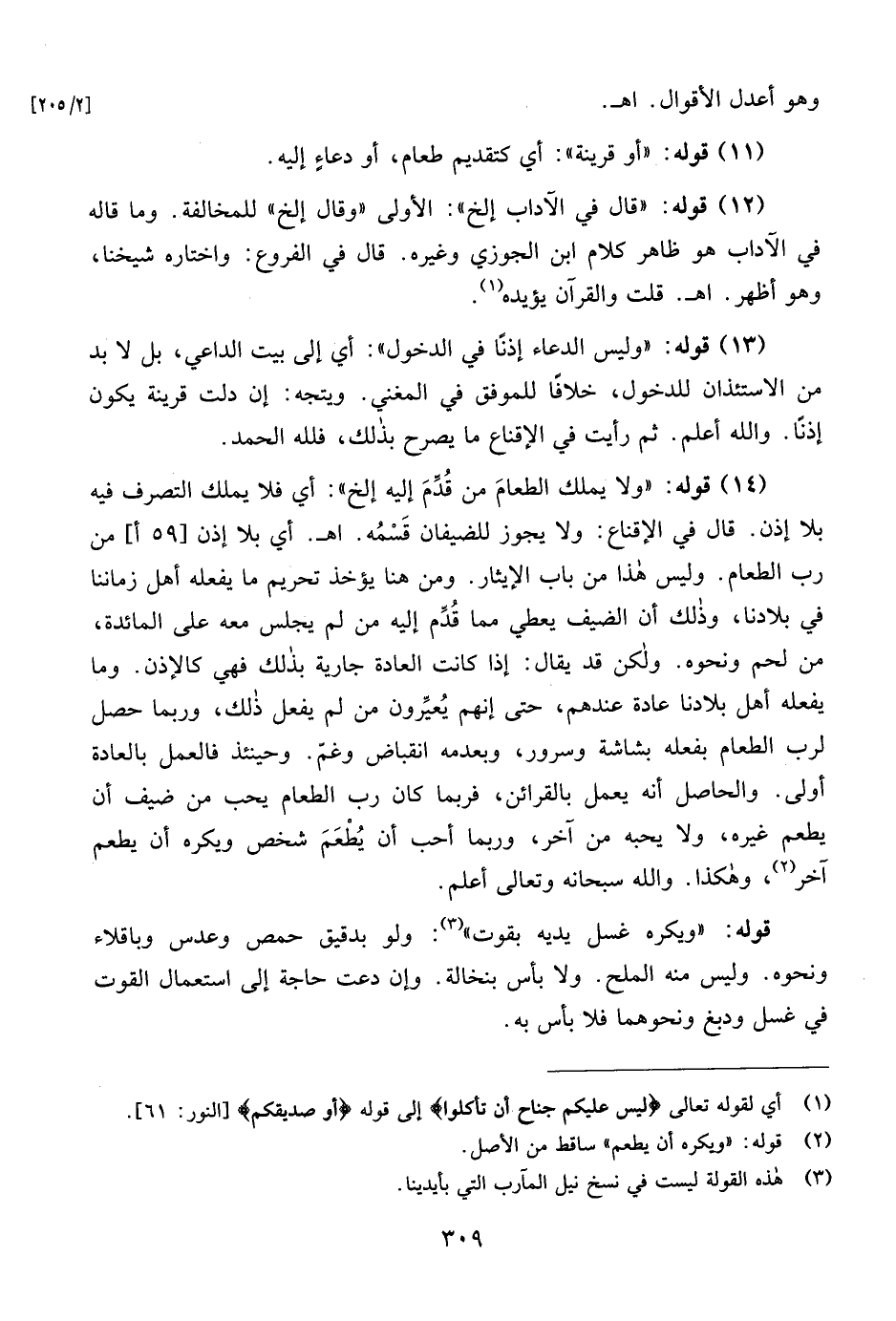 (13) قوله: "وليس الدعاء إذنًا في الدخول": أي إلى بيت الداعي، بل لا بد من الاستئذان للدخول، خلافًا للموفق في المغني. ويتجه: إن دلت قرينة يكون إذنًا. والله أعلم. ثم رأيت في الإقناع ما يصرح بذلك، فلله الحمد.