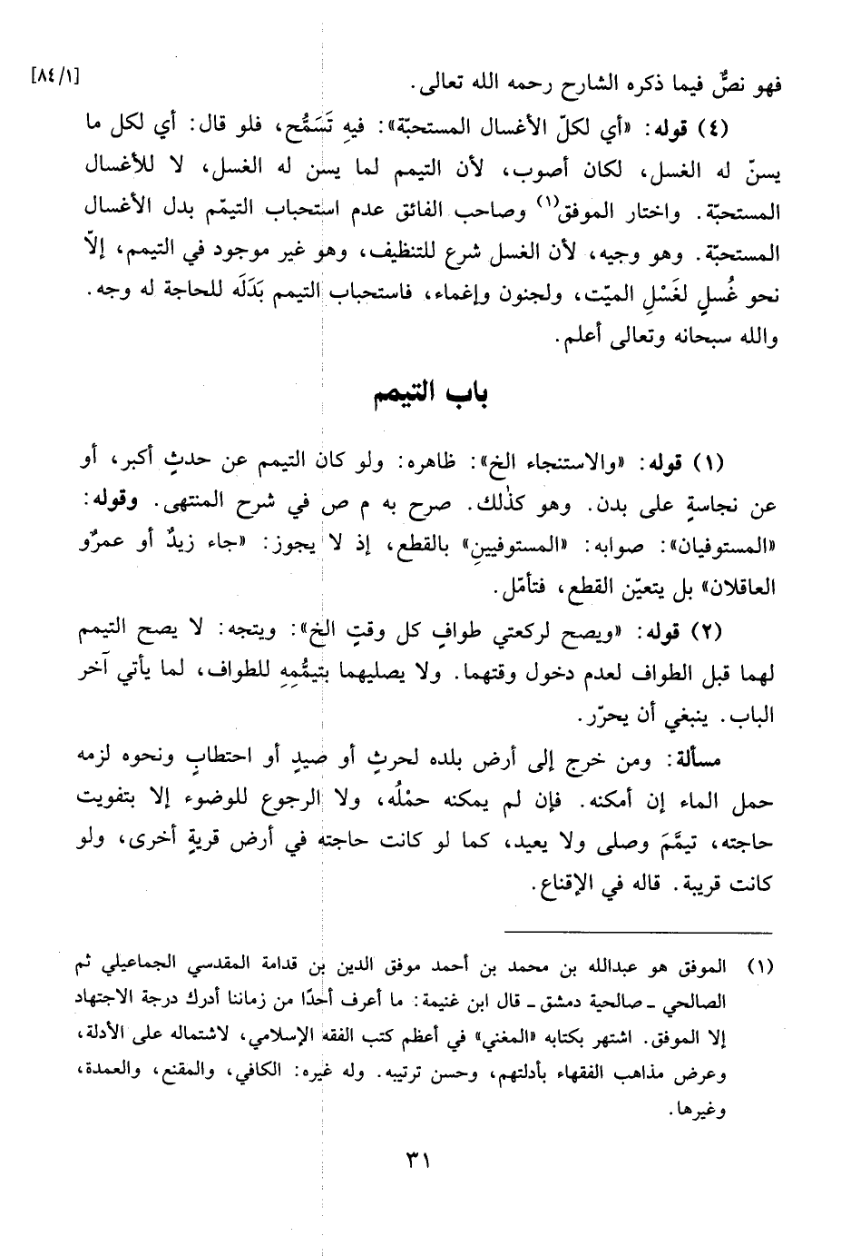 (¬1) الموفق هو عبد الله بن محمد بن أحمد موفق الدين بن قدامة المقدسي الجماعيلي ثم الصالحين - صالحية دمشق- قال ابن غنيمة: ما أعرف أحدًا من زماننا أدرك درجة الاجتهاد إلا الموفق. اشتهر بكتابه "المغني" في أعظم كتب الفقه الإسلامي، لاشتماله على الأدلة، وعرض مذاهب الفقهاء بأدلتهم، وحسن ترتيبه. وله غيره: الكافي، والمقنع، والعمدة، وغيرها.