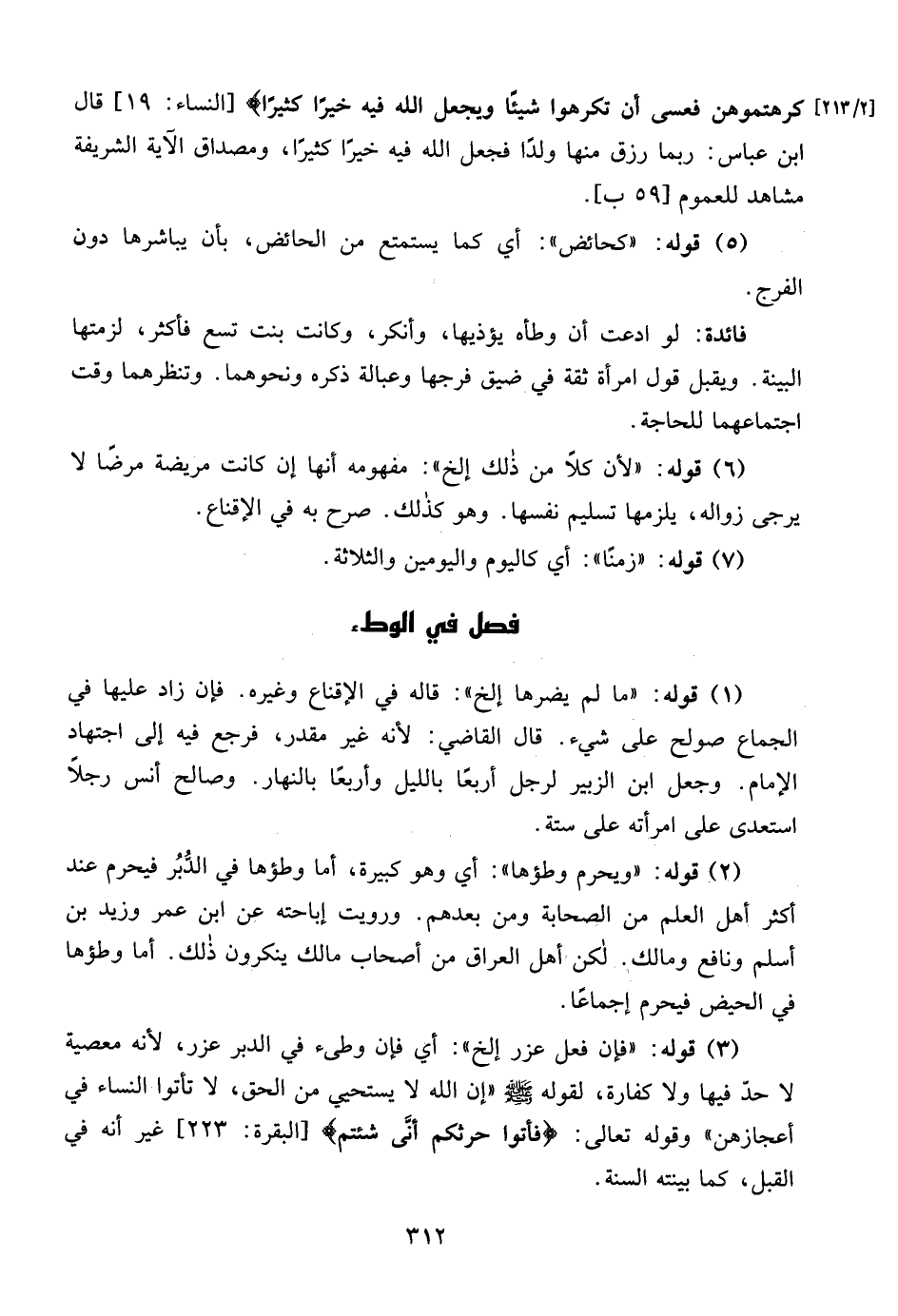 (2) قوله: "ويحرم وطؤها": أي وهو كبيرة، أما وطؤها في الدُّبُر فيحرم عند أكثر أهل العلم من الصحابة ومن بعدهم. ورويت إباحته عن ابن عمر وزيد بن أسلم ونافع ومالك. لكن أهل العراق من أصحاب مالك ينكرون ذلك. أما وطؤها في الحيض فيحرم إجماعًا.