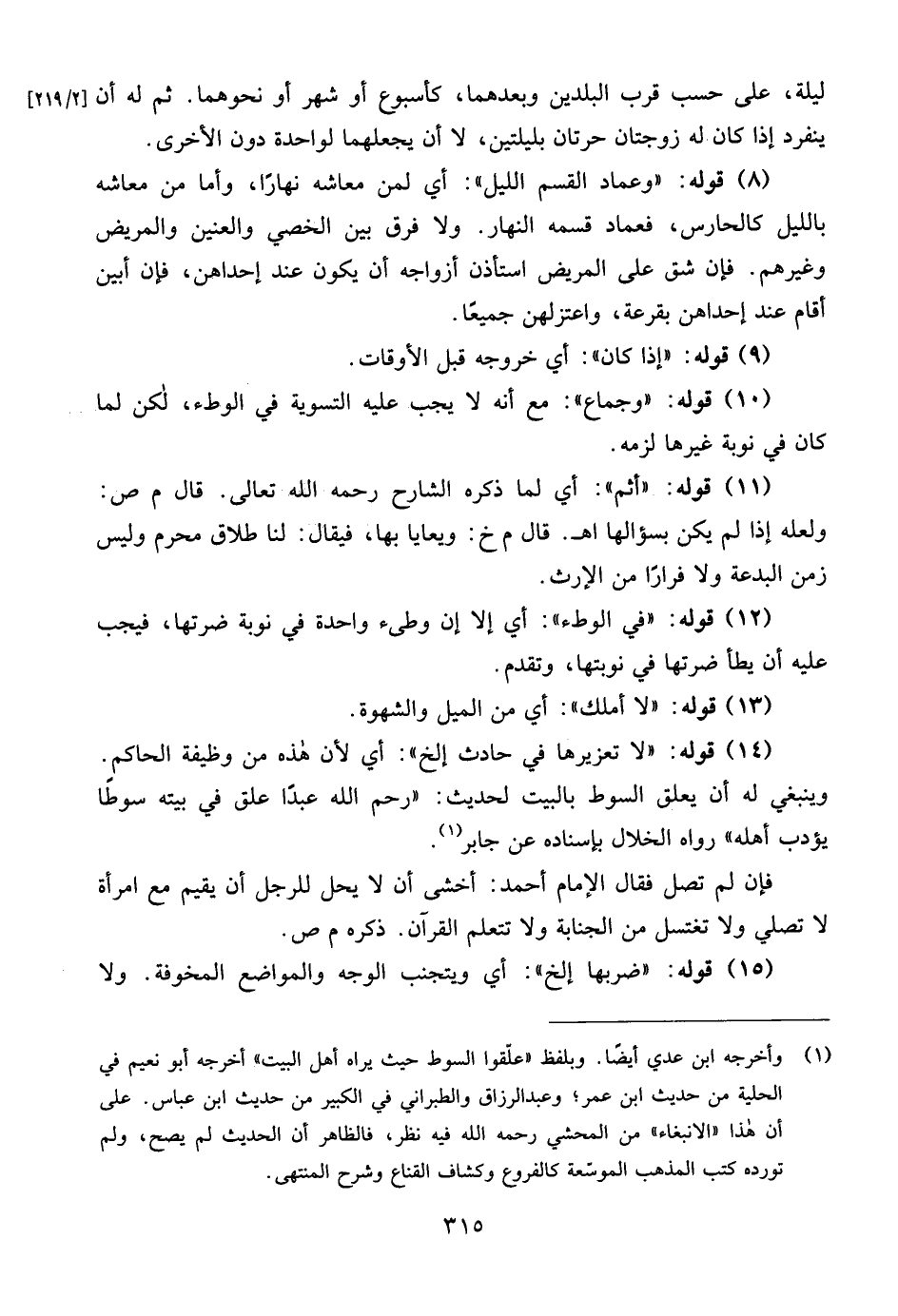 (8) قوله: "وعماد القسم الليل": أي لمن معاشه نهارًا، وأما من معاشه بالليل كالحارس، فعماد قسمه النهار. ولا فرق بين الخصي والعنين والمريض وغيرهم. فإن شق على المريض استأذن أزواجه أن يكون عند إحداهن، فإن أبين أقام عند إحداهن بقرعة، واعتزلهن جميعًا.