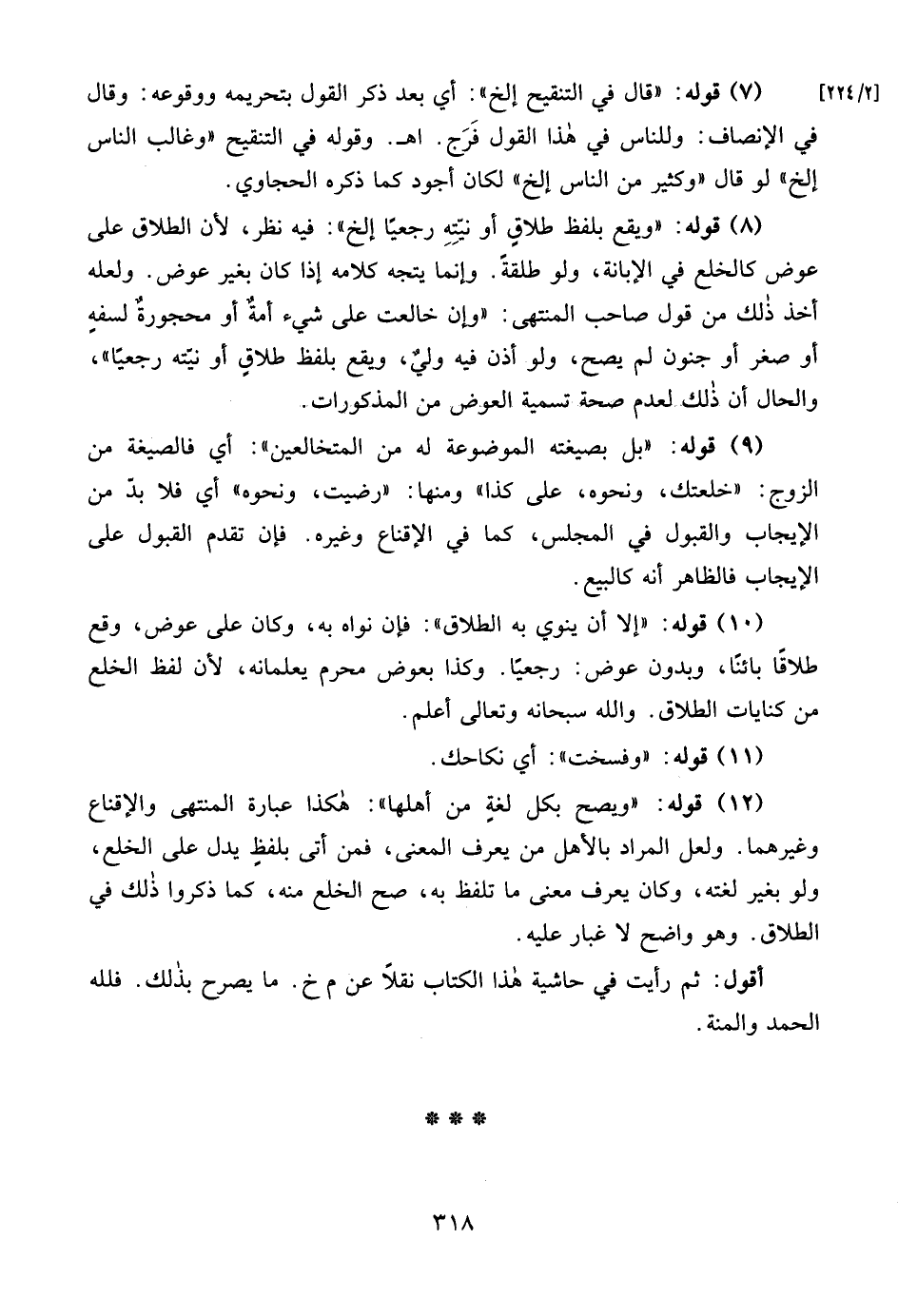 (12) قوله: "ويصح بكل لغةٍ من أهلها": هكذا عبارة المنتهى والإقناع وغيرهما. ولعل المراد بالأهل من يعرف المعنى، فمن أتى بلفظٍ يدل على الخلع، ولو بغير لغته، وكان يعرف معنى ما تلفظ به، صح الخلع منه، كما ذكروا ذلك في الطلاق. وهو واضح لا غبار عليه.