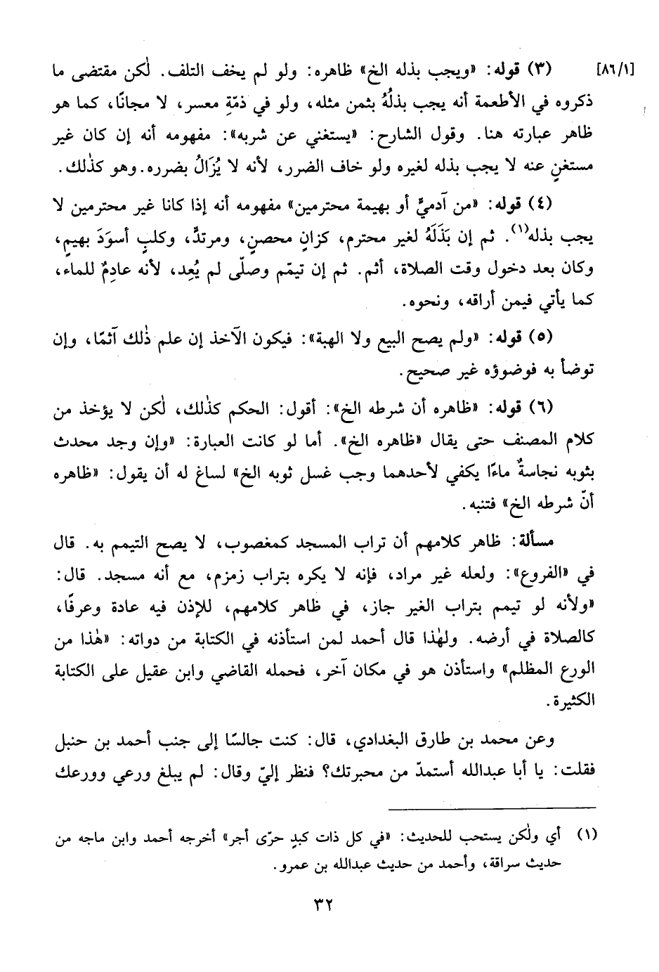 [1/ 86] (3) قوله: "ويجب بذله الخ" ظاهره: ولو لم يخف التلف. لكن مقتضى ما ذكروه في الأطعمة أنه يجب بذلُهُ بثمن مثله، ولو في ذمّةِ معسر، لا مجانًا، كما هو ظاهر عبارته هنا. وقول الشارح: "يستغني عن شربه": مفهومه أنه إن كان غير مستغنٍ عنه لا يجب بذله لغيره ولو خاف الضرر، لأنه لا يُزَالُ بضرره. وهو كذلك.